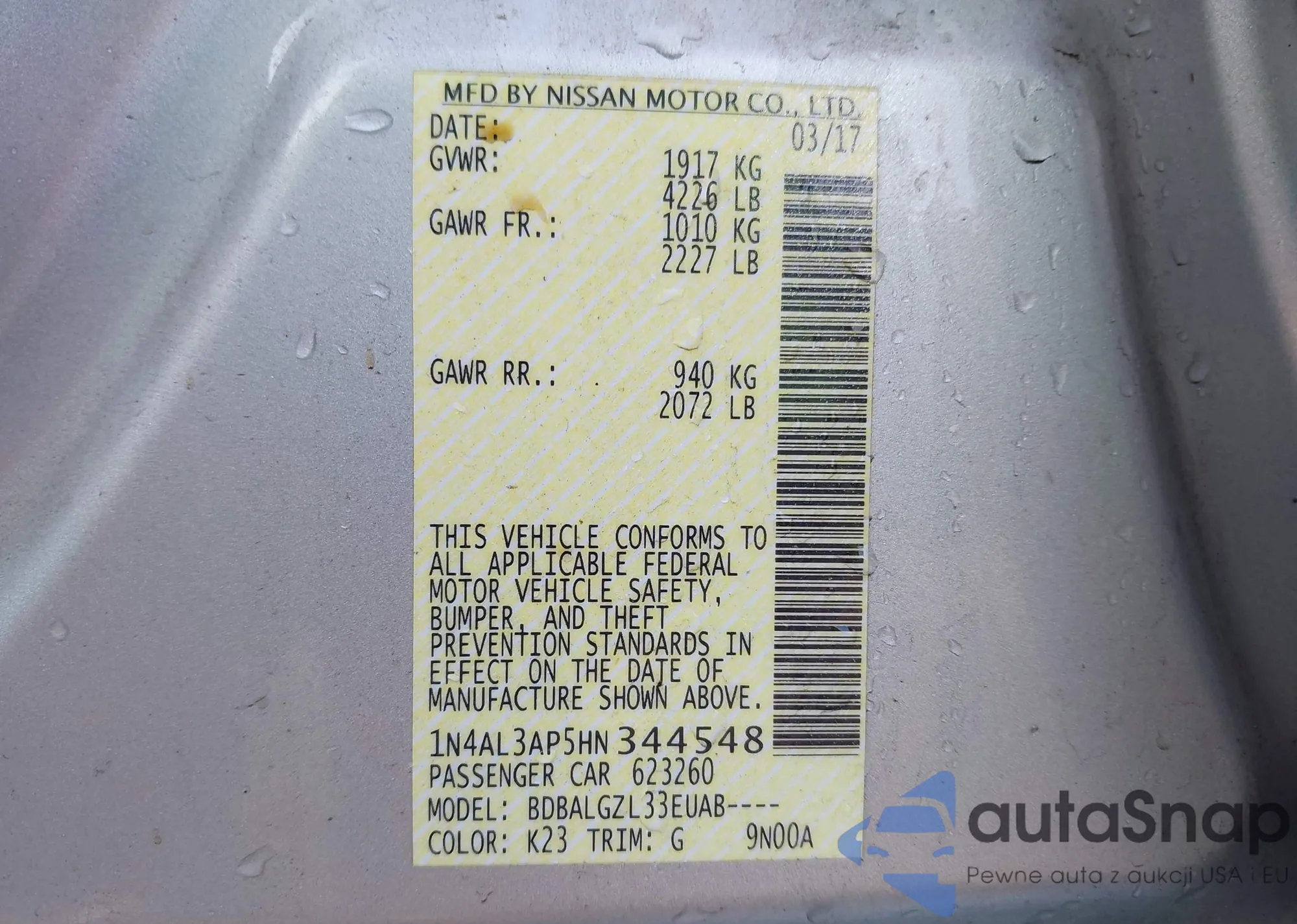 Samochód Nissan Altima 2017 (VIN 1N4AL3AP5HN344548) nie był wcześniej licytowany. Dokumenty są czyste, przebieg odpowiada lub jest niższy niż średnia rynku. Sprzedaje go firma ubezpieczeniowa – polecamy zakup. Dostawa do portu zajmie ok. 6–8 tygodni.
