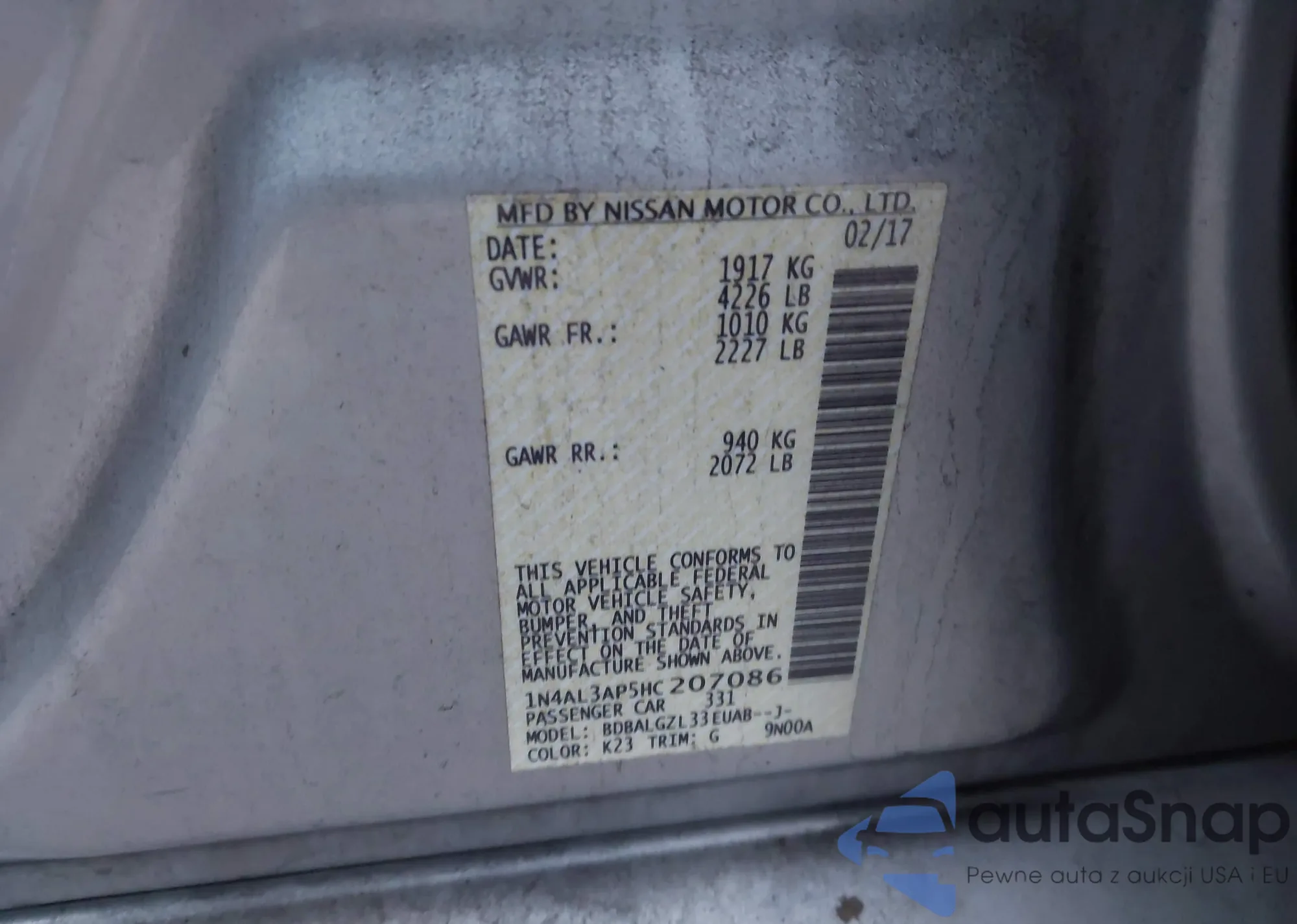 Samochód Nissan Altima 2017 (VIN 1N4AL3AP5HC207086) nie był wcześniej licytowany. Dokumenty są czyste, przebieg odpowiada lub jest niższy niż średnia rynku. Sprzedaje go firma ubezpieczeniowa – polecamy zakup. Dostawa do portu zajmie ok. 6–8 tygodni.