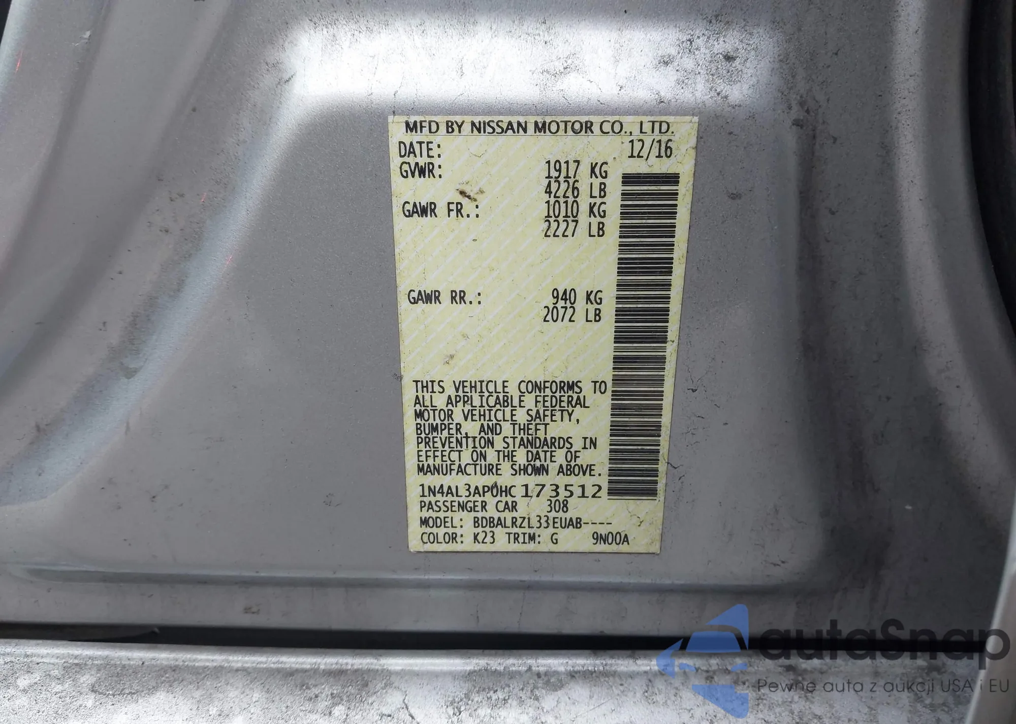 Samochód Nissan Altima 2017 (VIN 1N4AL3AP0HC173512) nie był wcześniej licytowany. Dokumenty są czyste, przebieg odpowiada lub jest niższy niż średnia rynku. Sprzedaje go firma ubezpieczeniowa – polecamy zakup. Dostawa do portu zajmie ok. 6–8 tygodni.