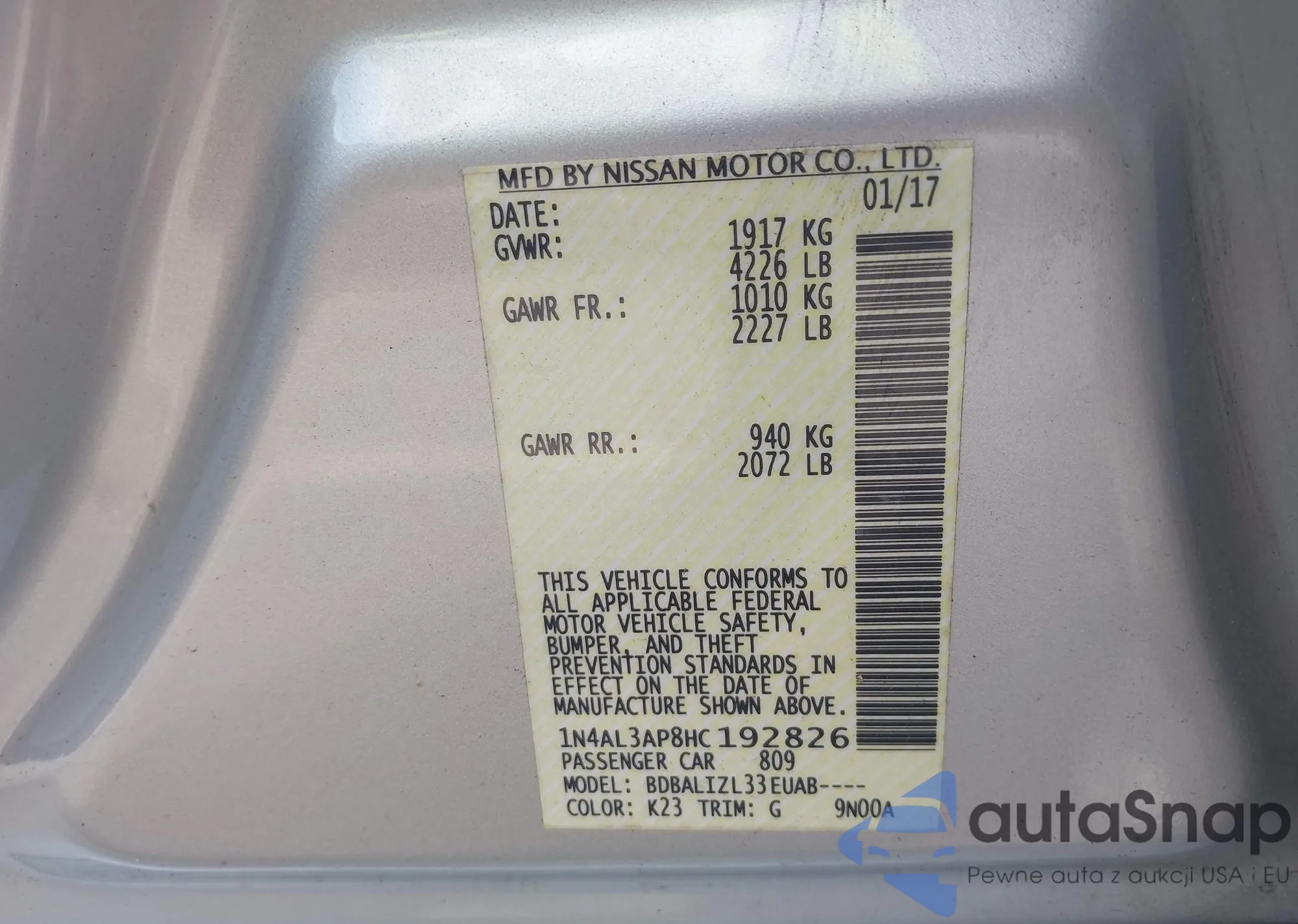 VIN: 1N4AL3AP8HC192826