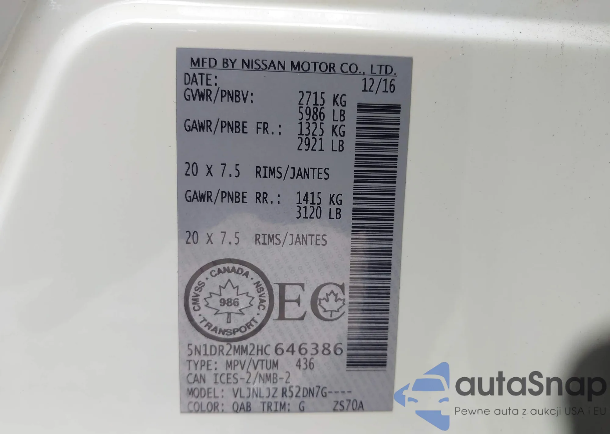 Samochód Nissan Pathfinder 2017 (VIN 5N1DR2MM2HC646386) ma dokumenty uniemożliwiające rejestrację. Mogą pojawić się trudności przy eksporcie i rejestracji. Skontaktuj się z ekspertami AutaSnap w celu znalezienia alternatywy.