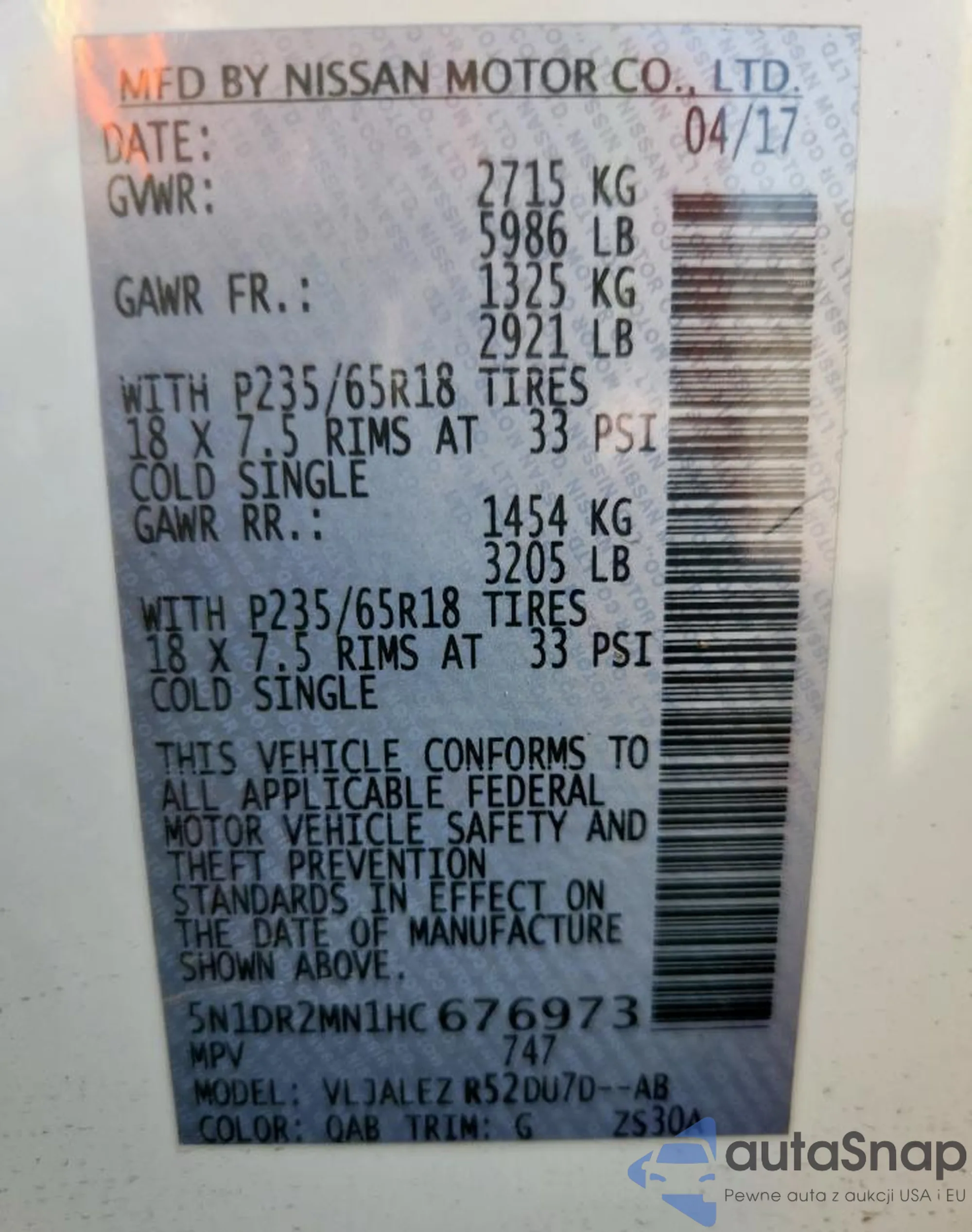 • VIN: 5N1DR2MN1HC676973