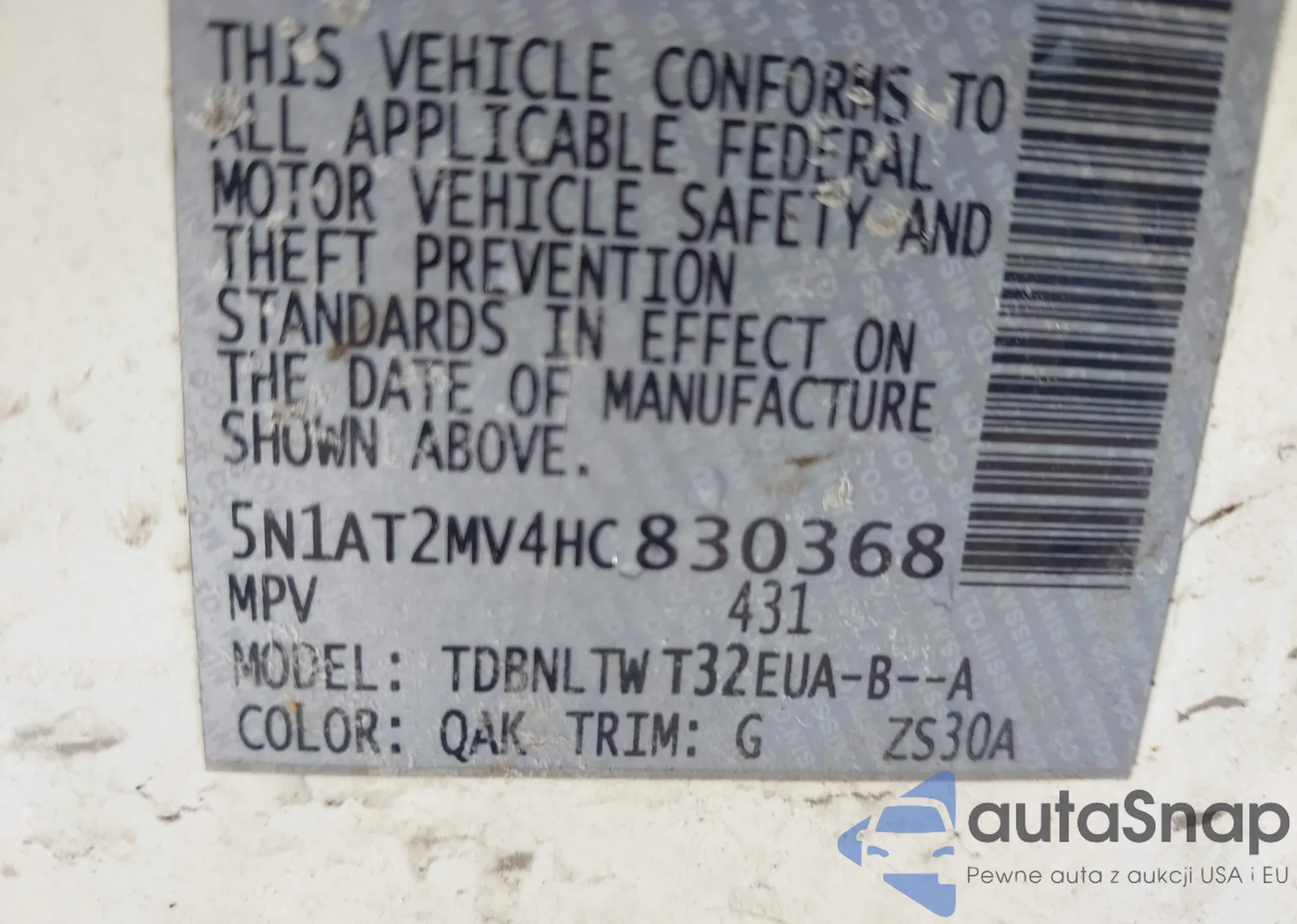 Samochód Nissan Rogue 2017 (VIN 5N1AT2MV4HC830368) nie był wcześniej licytowany. Dokumenty są czyste, przebieg odpowiada lub jest niższy niż średnia rynku. Sprzedaje go firma ubezpieczeniowa – polecamy zakup. Dostawa do portu zajmie ok. 6–8 tygodni.