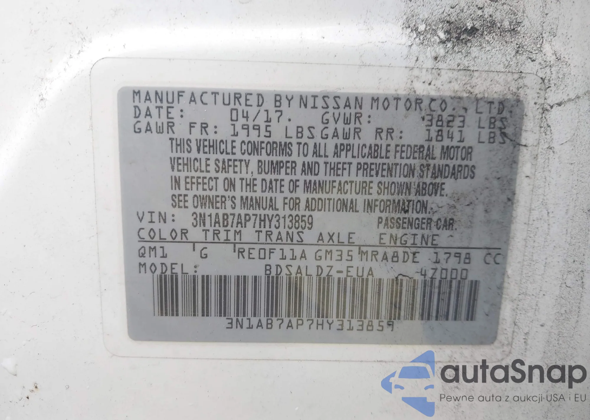 Samochód Nissan Sentra 2017 (VIN 3N1AB7AP7HY313859) nie był wcześniej licytowany. Dokumenty są czyste, przebieg odpowiada lub jest niższy niż średnia rynku. Sprzedaje go firma ubezpieczeniowa – polecamy zakup. Dostawa do portu zajmie ok. 6–8 tygodni.