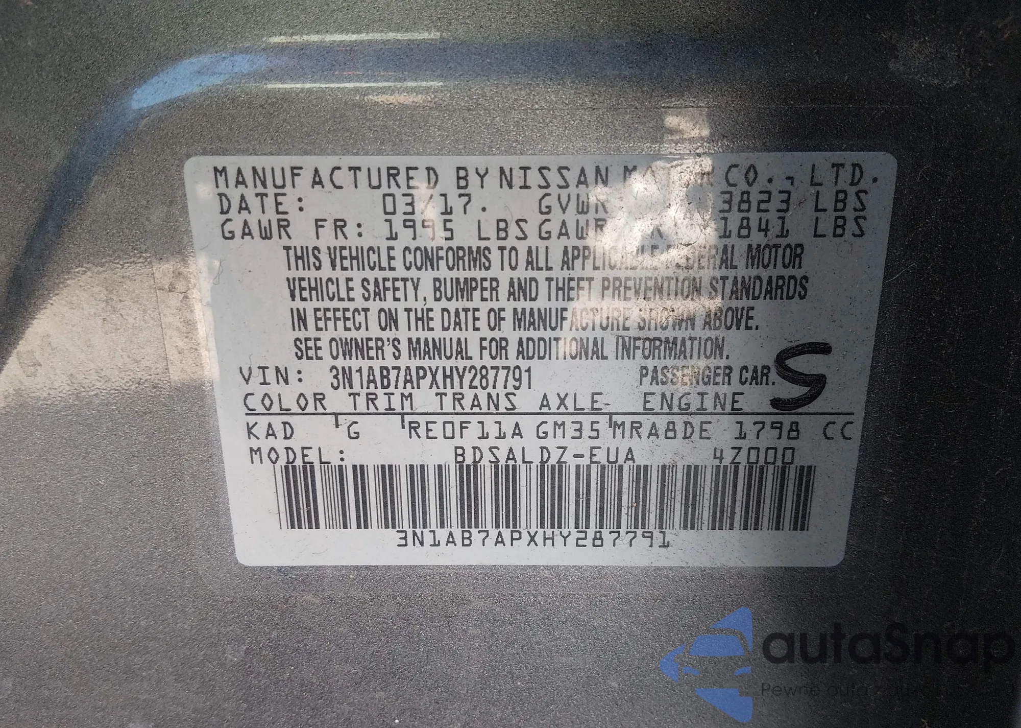 Samochód Nissan Sentra 2017 (VIN 3N1AB7APXHY287791) ma dokumenty uniemożliwiające rejestrację. Mogą pojawić się trudności przy eksporcie i rejestracji. Skontaktuj się z ekspertami AutaSnap w celu znalezienia alternatywy.