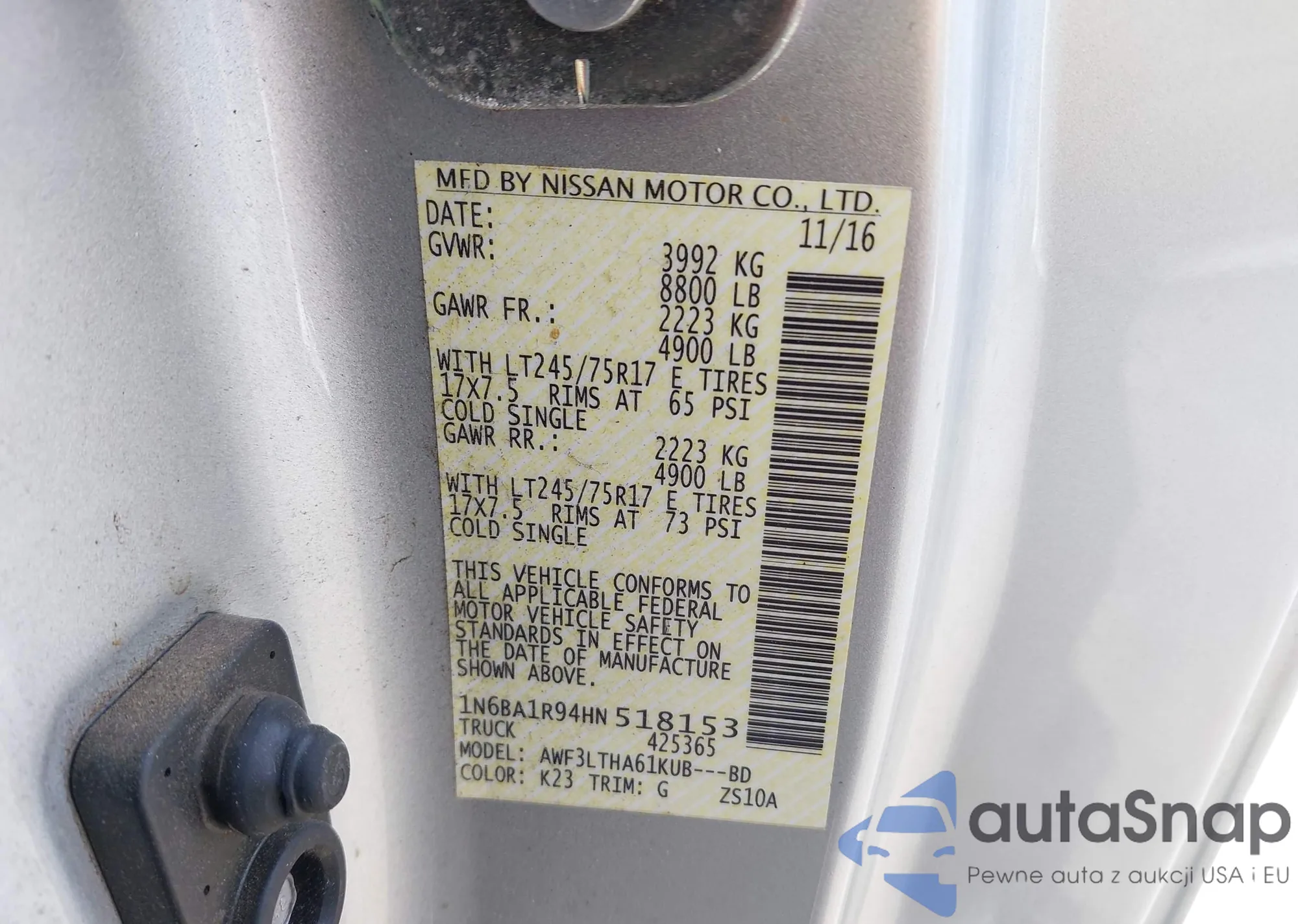 Samochód Nissan Titan 2017 (VIN 1N6BA1R94HN518153) sprzedaje go niezweryfikowany sprzedawca. Zalecamy raport Carfax i potwierdzenie możliwości rejestracji pojazdu przed zakupem.