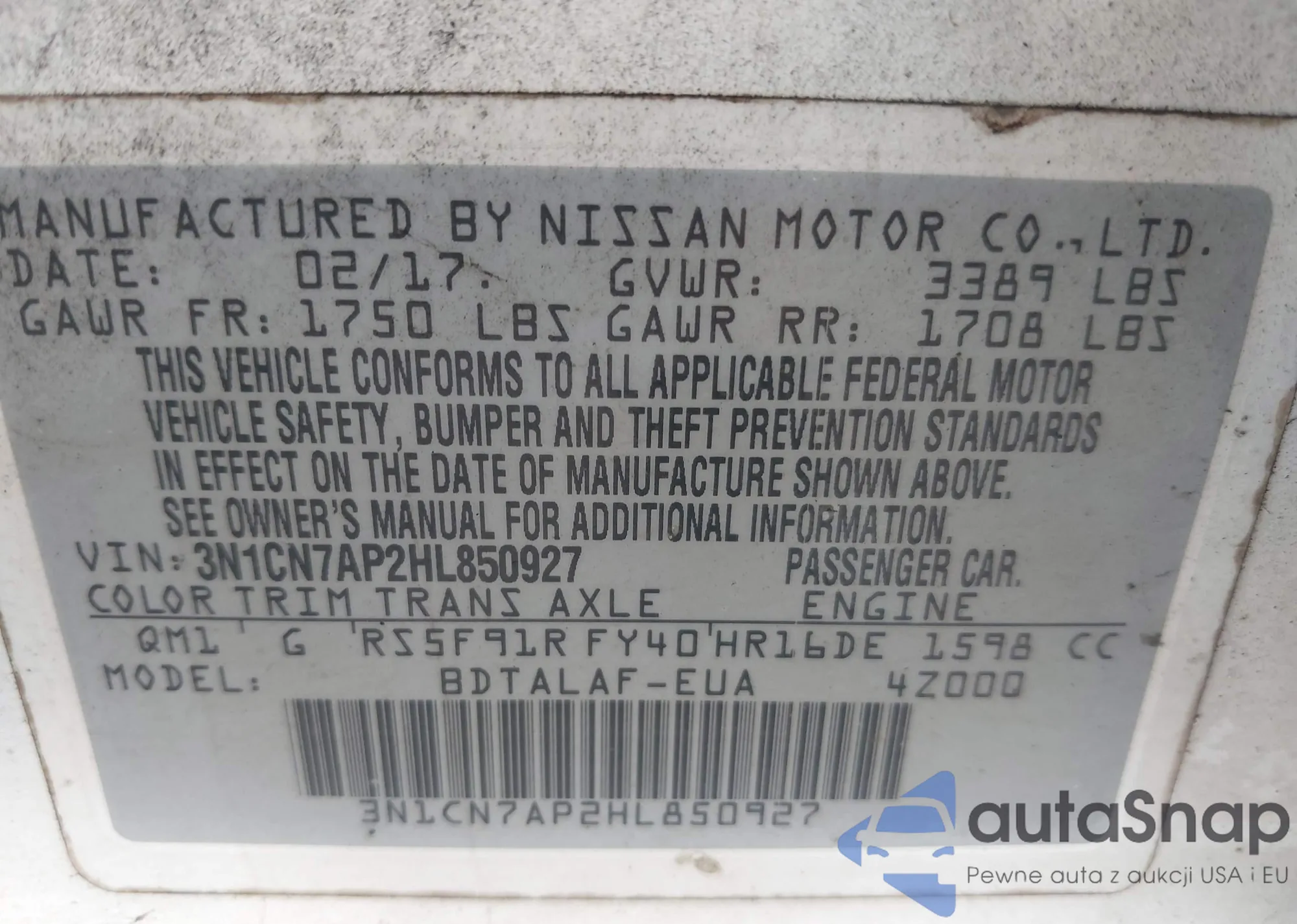 VIN: 3N1CN7AP2HL850927