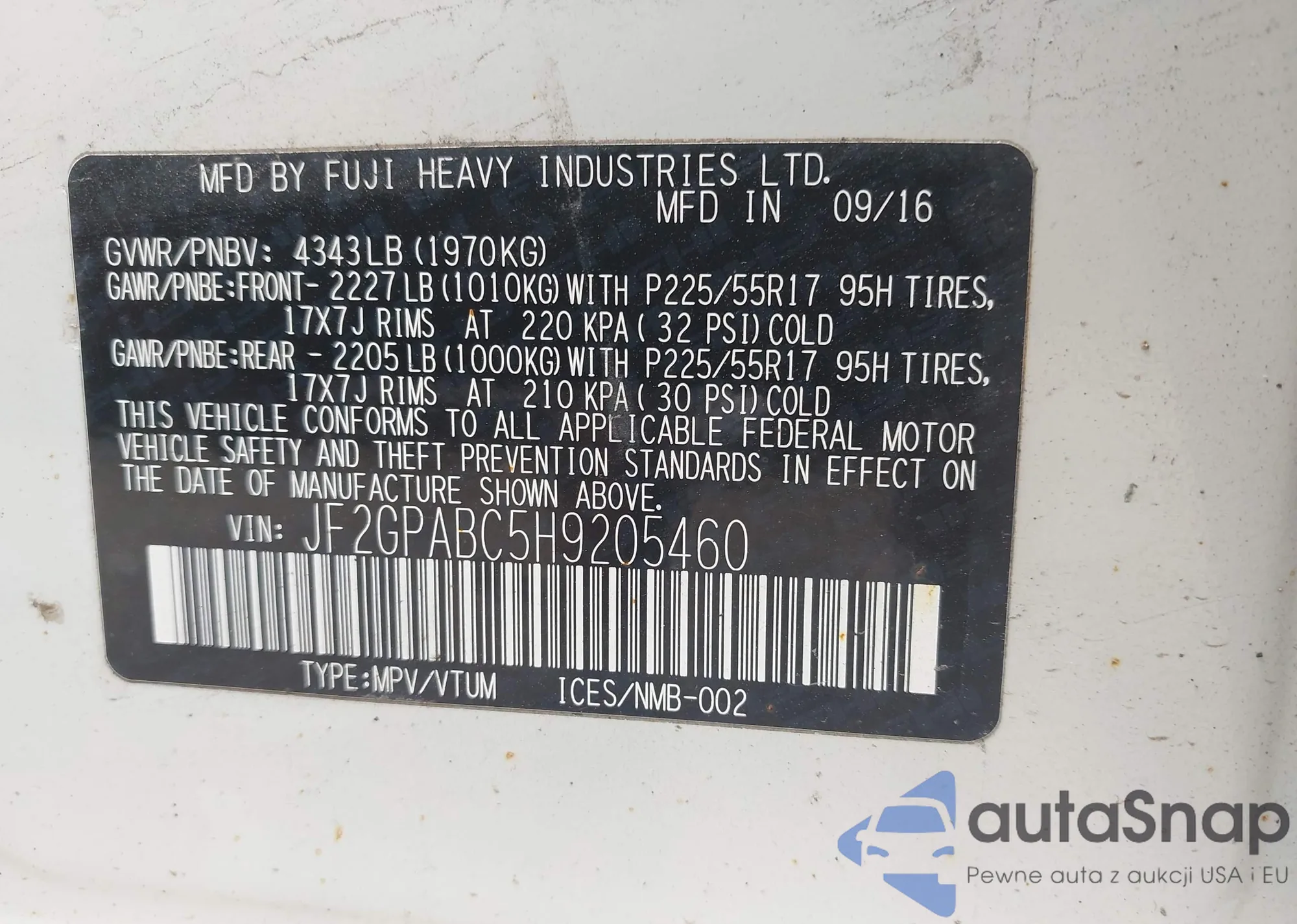 VIN: JF2GPABC5H9205460