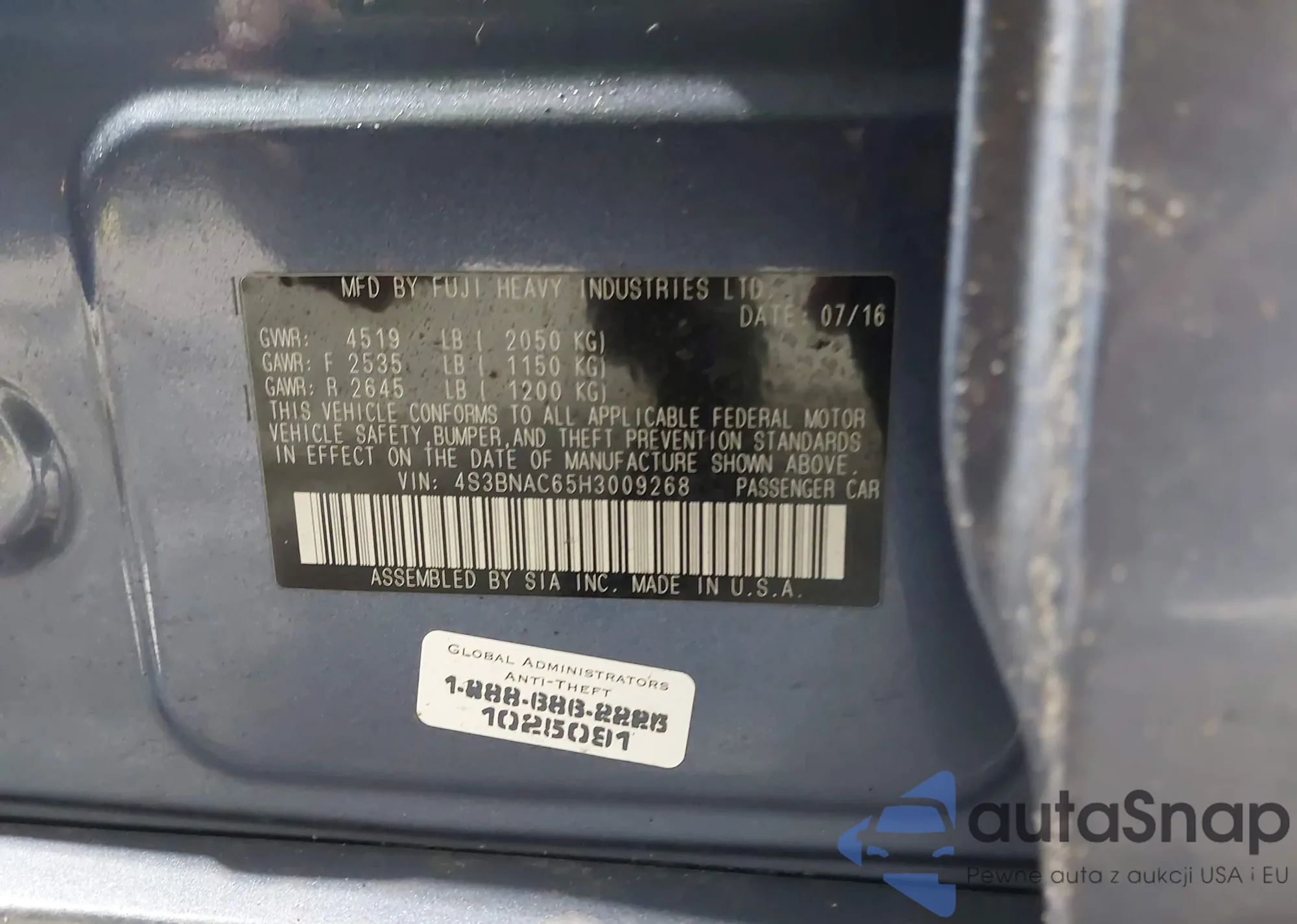 Samochód Subaru Legacy 2017 (VIN 4S3BNAC65H3009268) nie był wcześniej licytowany. Dokumenty są czyste, przebieg odpowiada lub jest niższy niż średnia rynku. Sprzedaje go firma ubezpieczeniowa – polecamy zakup. Dostawa do portu zajmie ok. 6–8 tygodni.