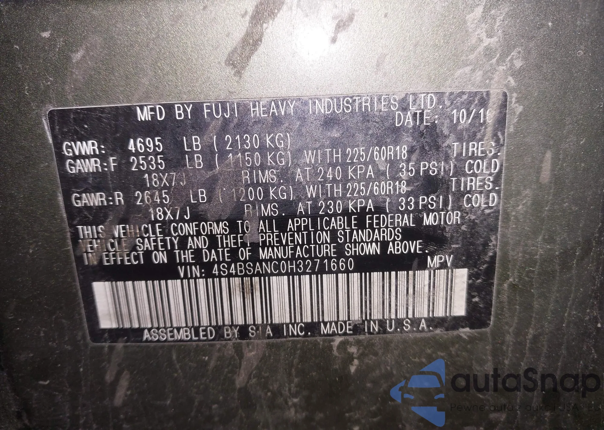Samochód Subaru Outback 2017 (VIN 4S4BSANC0H3271660) nie był wcześniej licytowany. Dokumenty są czyste, przebieg odpowiada lub jest niższy niż średnia rynku. Sprzedaje go firma ubezpieczeniowa – polecamy zakup. Dostawa do portu zajmie ok. 6–8 tygodni.