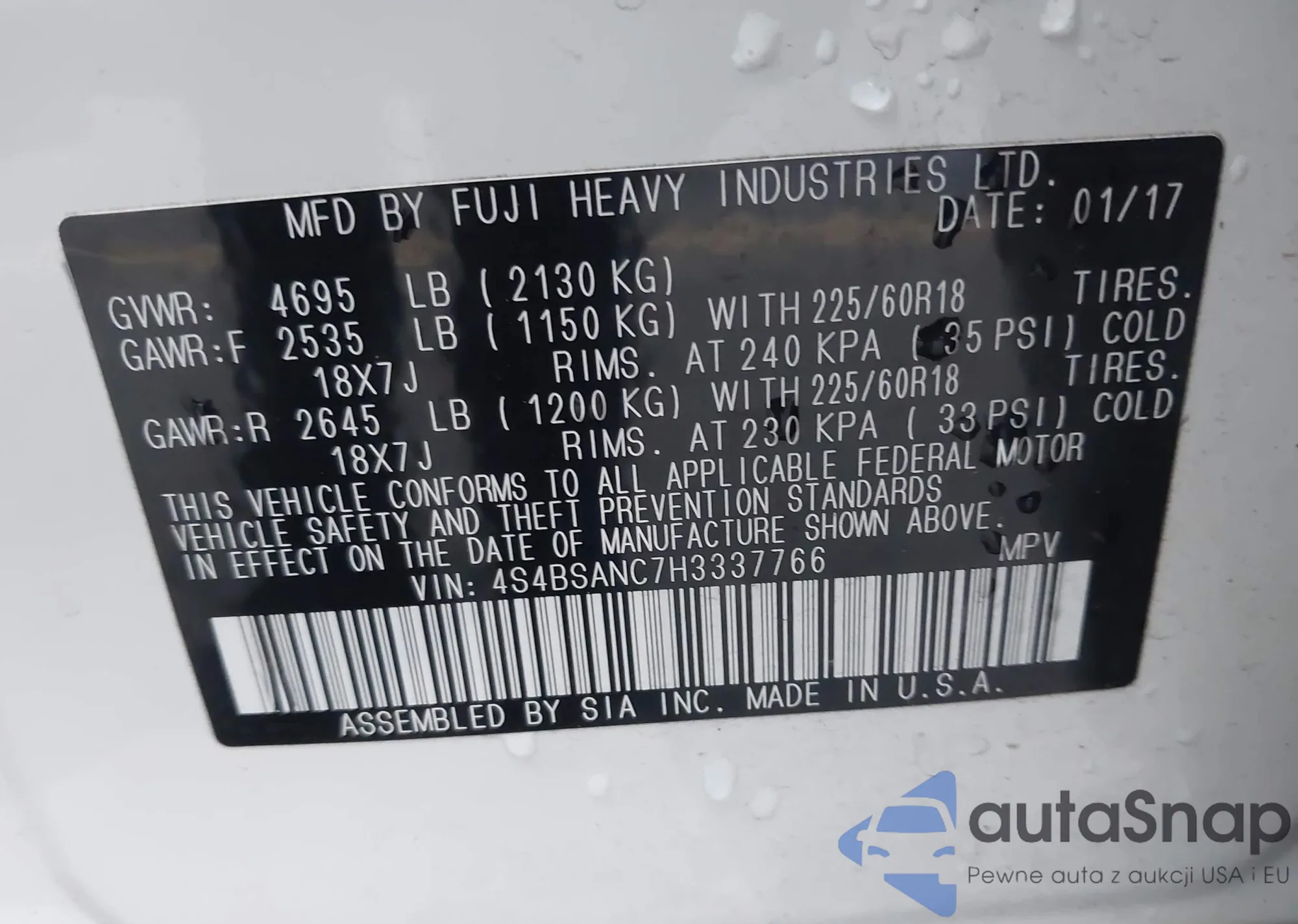 Samochód Subaru Outback 2017 (VIN 4S4BSANC7H3337766) nie był wcześniej licytowany. Dokumenty są czyste, przebieg odpowiada lub jest niższy niż średnia rynku. Sprzedaje go firma ubezpieczeniowa – polecamy zakup. Dostawa do portu zajmie ok. 6–8 tygodni.