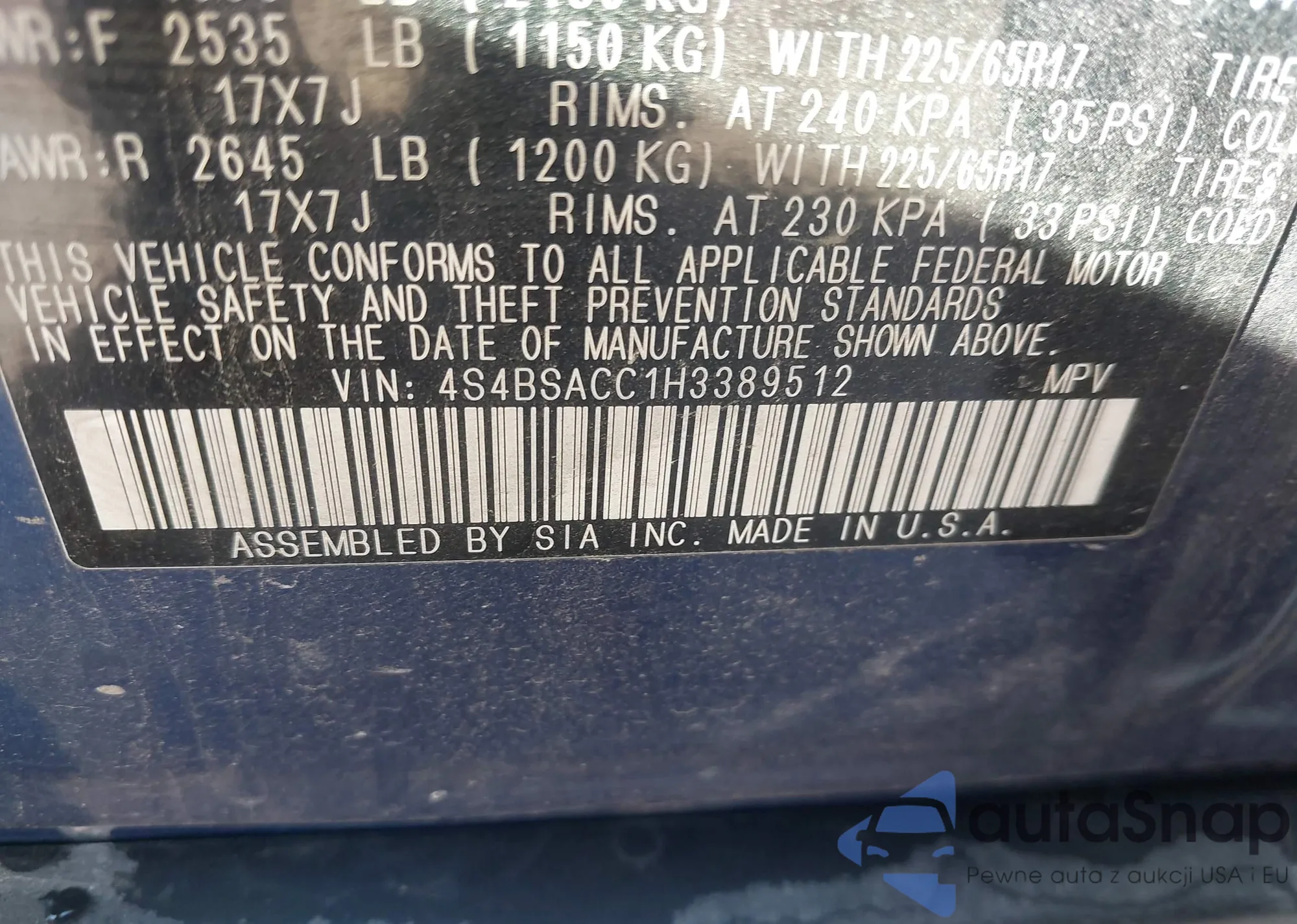 Samochód Subaru Outback 2017 (VIN 4S4BSACC1H3389512) nie był wcześniej licytowany. Dokumenty są czyste, przebieg odpowiada lub jest niższy niż średnia rynku. Sprzedaje go firma ubezpieczeniowa – polecamy zakup. Dostawa do portu zajmie ok. 6–8 tygodni.