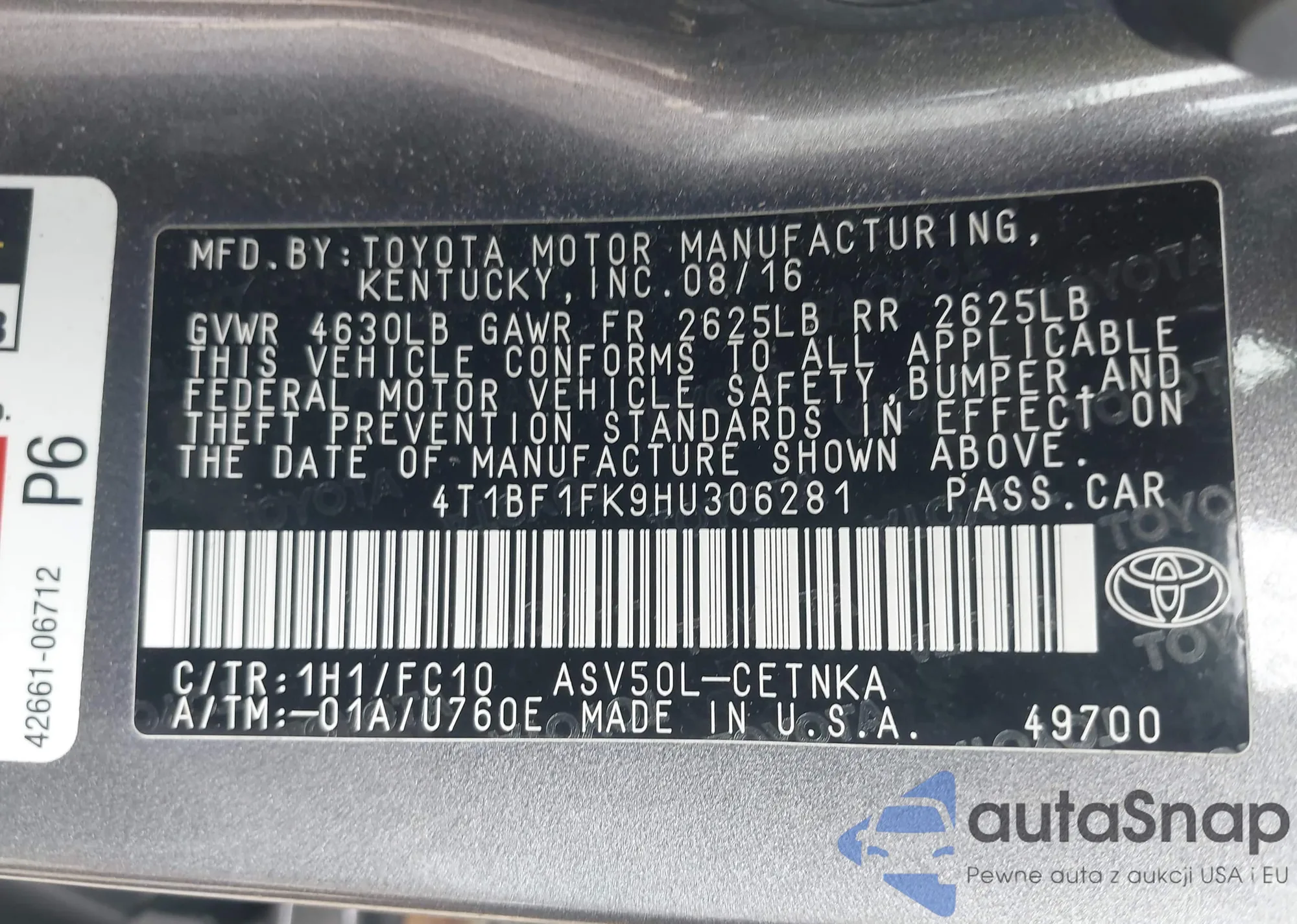 • VIN: 4T1BF1FK9HU306281