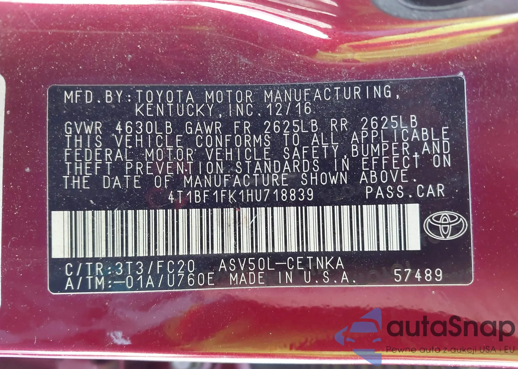 Samochód Toyota Camry 2017 (VIN 4T1BF1FK1HU718839) nie był wcześniej licytowany. Dokumenty są czyste, przebieg odpowiada lub jest niższy niż średnia rynku. Sprzedaje go firma ubezpieczeniowa – polecamy zakup. Dostawa do portu zajmie ok. 6–8 tygodni.