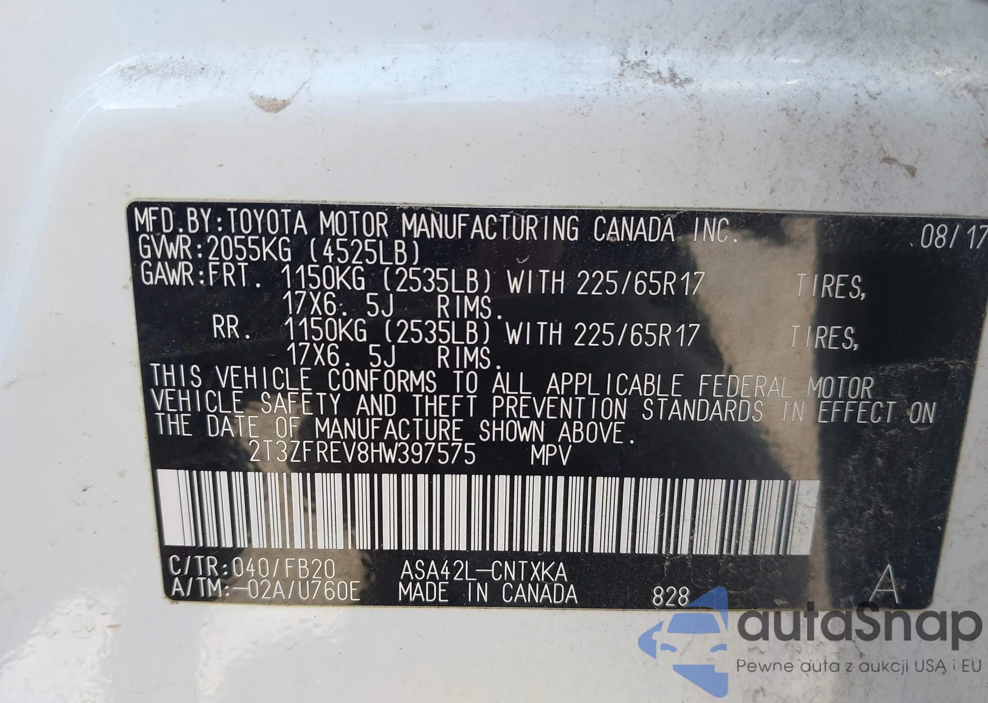 • VIN: 2T3ZFREV8HW397575