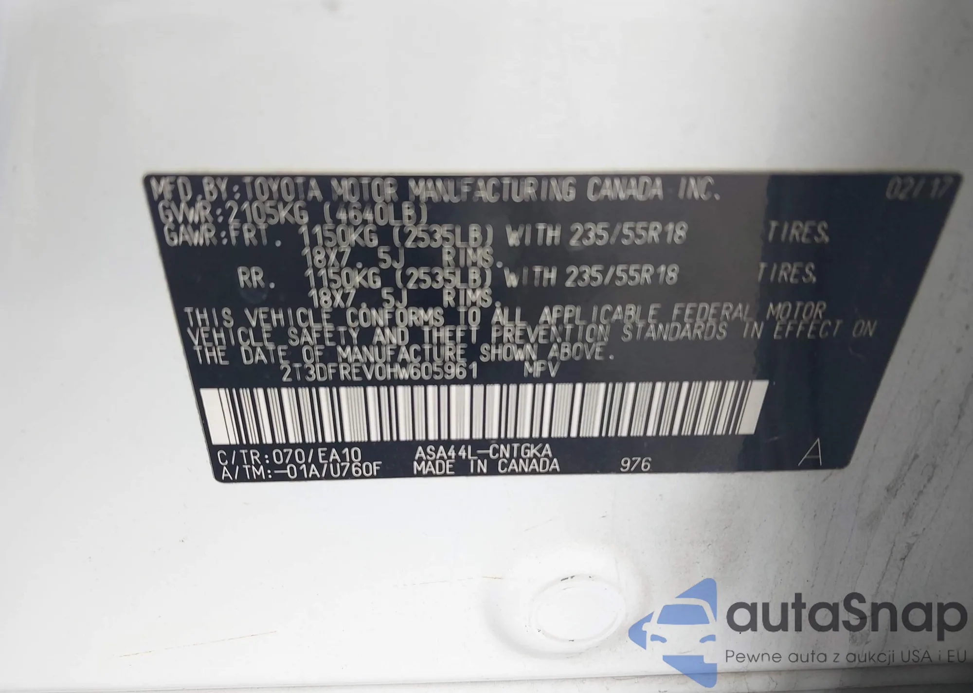 Samochód Toyota RAV 4 2017 (VIN 2T3DFREV0HW605961) nie był wcześniej licytowany. Dokumenty są czyste, przebieg odpowiada lub jest niższy niż średnia rynku. Sprzedaje go firma ubezpieczeniowa – polecamy zakup. Dostawa do portu zajmie ok. 6–8 tygodni.