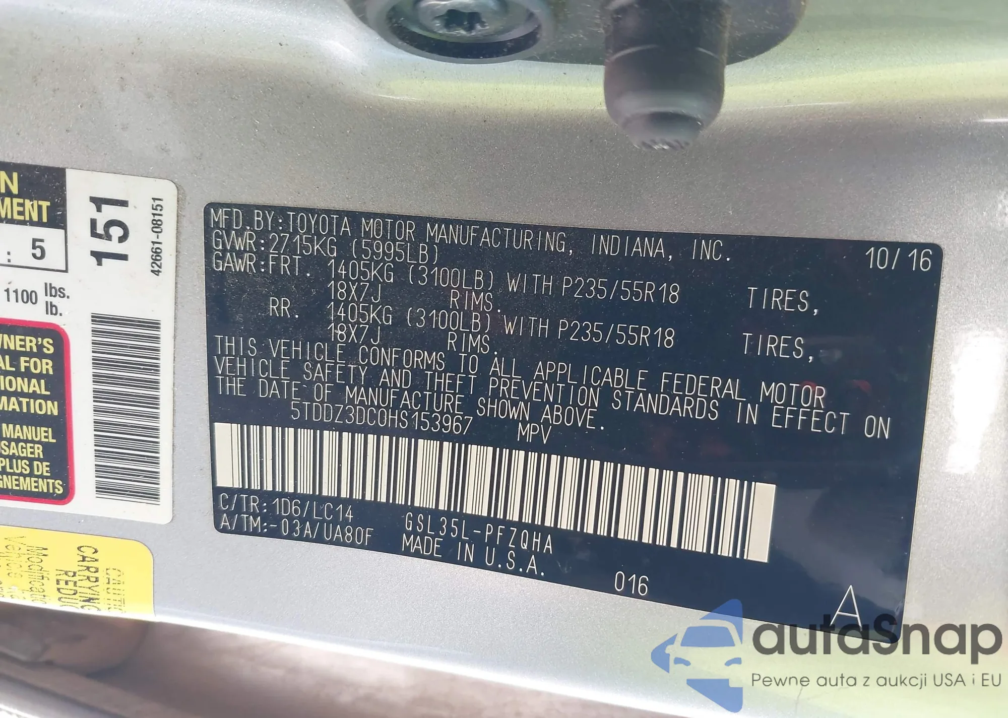 Samochód Toyota Sienna 2017 (VIN 5TDDZ3DC0HS153967) nie był wcześniej licytowany. Dokumenty są czyste, przebieg odpowiada lub jest niższy niż średnia rynku. Sprzedaje go firma ubezpieczeniowa – polecamy zakup. Dostawa do portu zajmie ok. 6–8 tygodni.