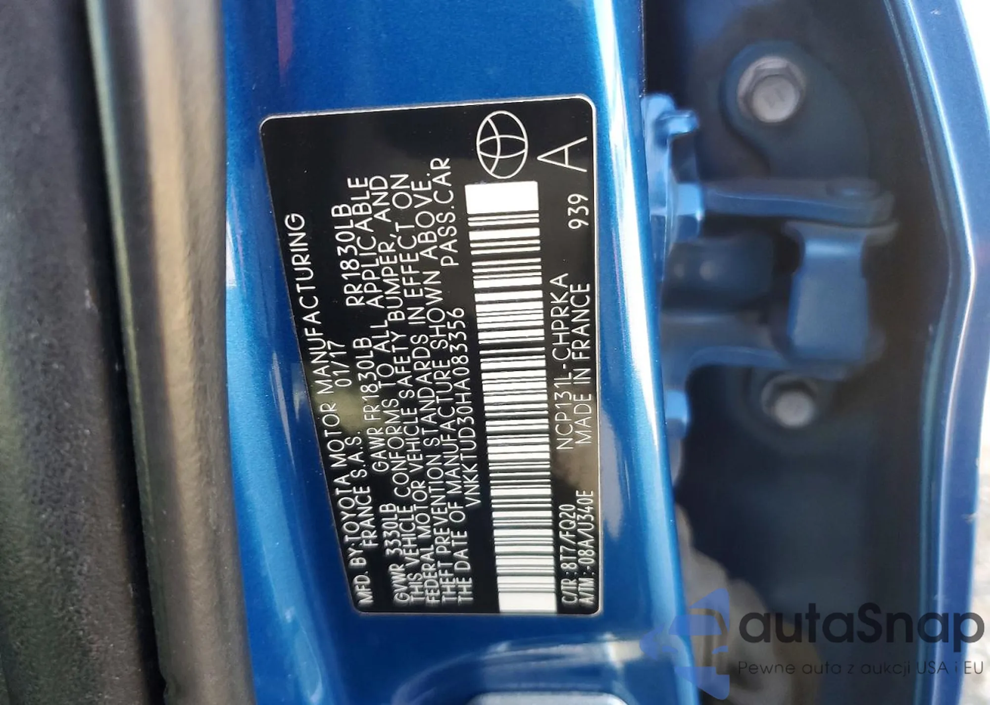 Samochód Toyota Yaris 2017 (VIN VNKKTUD30HA083356) nie był wcześniej licytowany. Dokumenty są czyste, przebieg odpowiada lub jest niższy niż średnia rynku. Sprzedaje go firma ubezpieczeniowa – polecamy zakup. Dostawa do portu zajmie ok. 6–8 tygodni.