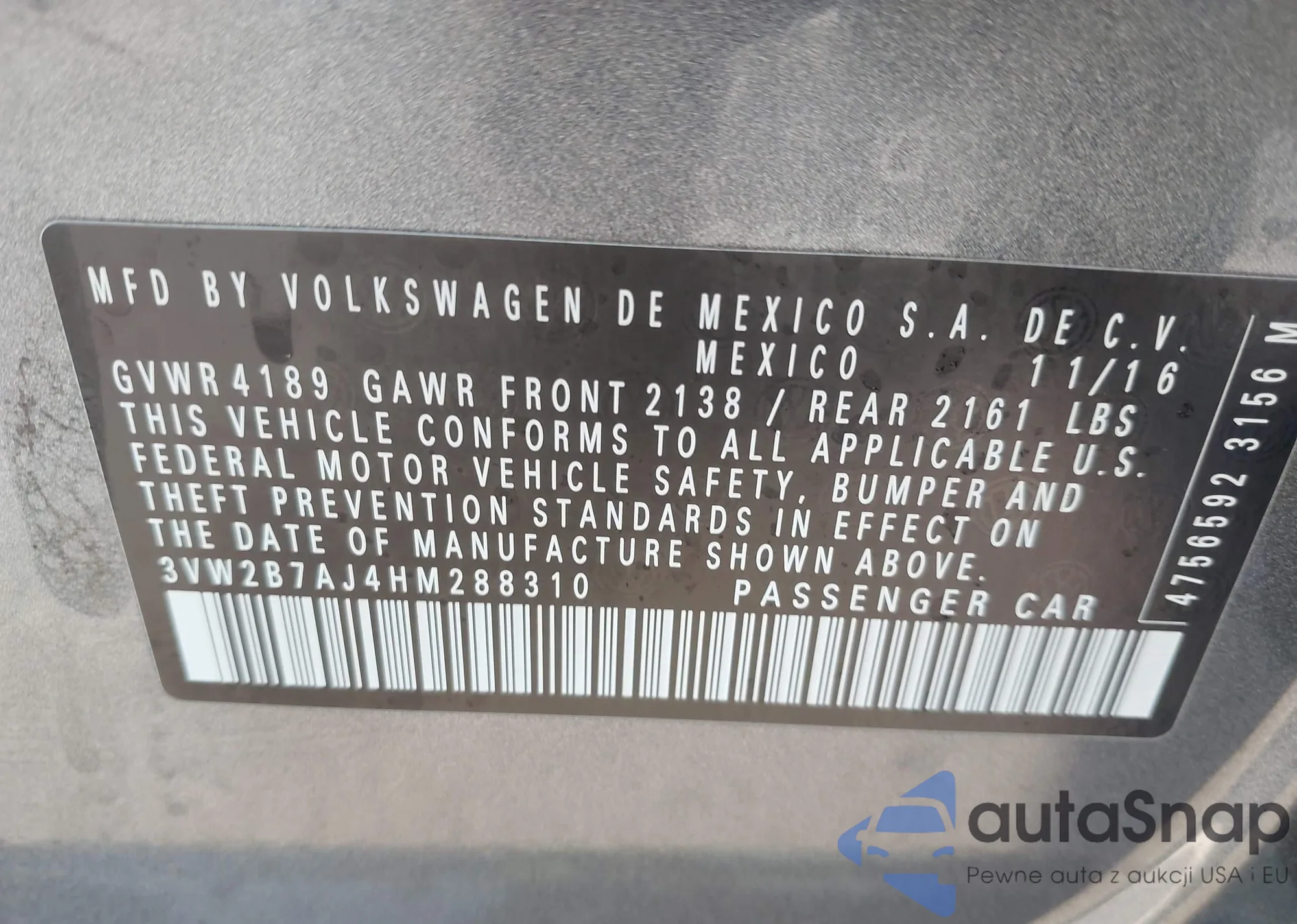 Samochód Volkswagen Jetta 2017 (VIN 3VW2B7AJ4HM288310) nie był wcześniej licytowany. Dokumenty są czyste, przebieg odpowiada lub jest niższy niż średnia rynku. Sprzedaje go firma ubezpieczeniowa – polecamy zakup. Dostawa do portu zajmie ok. 6–8 tygodni.