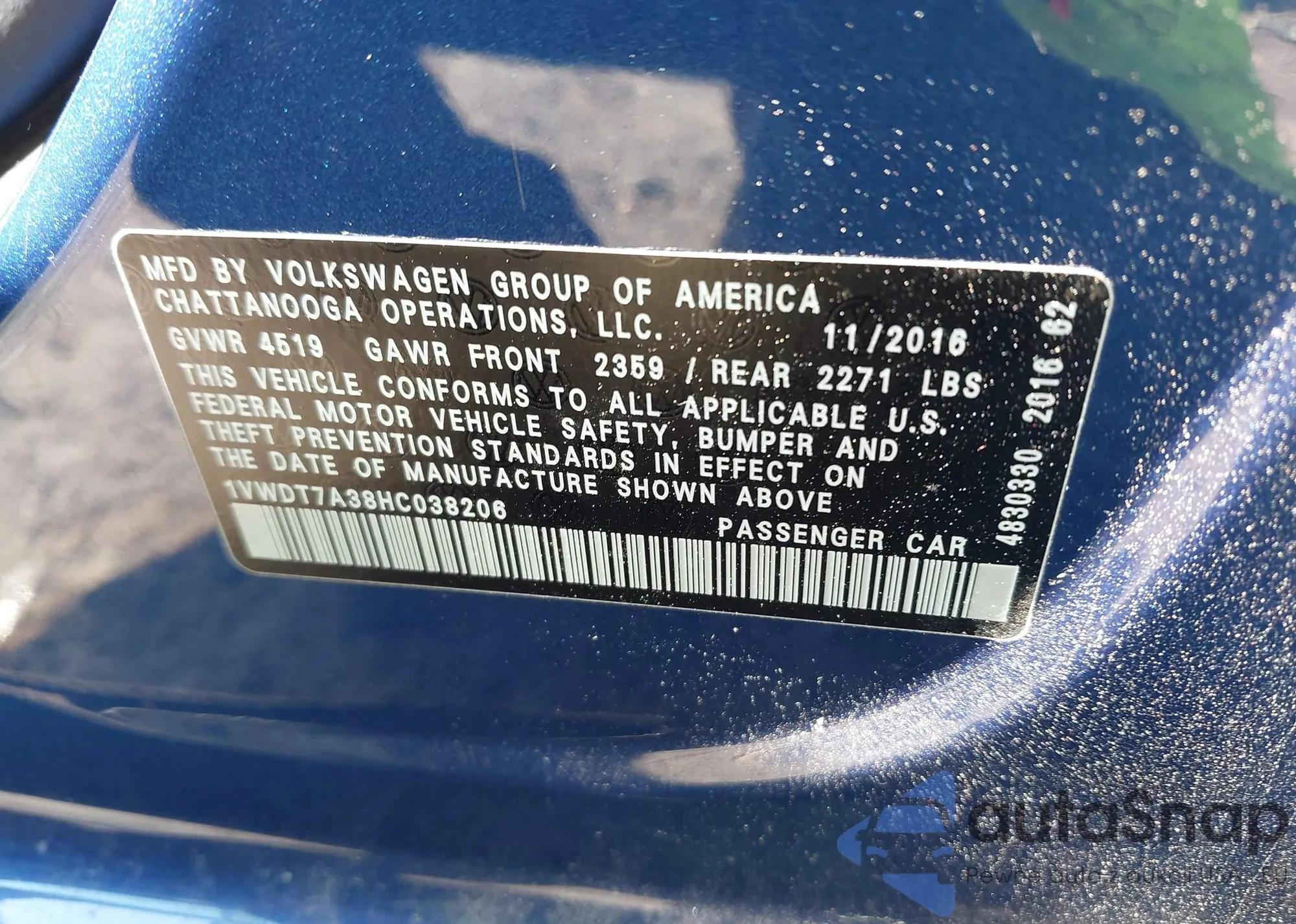 VIN: 1VWDT7A38HC038206
