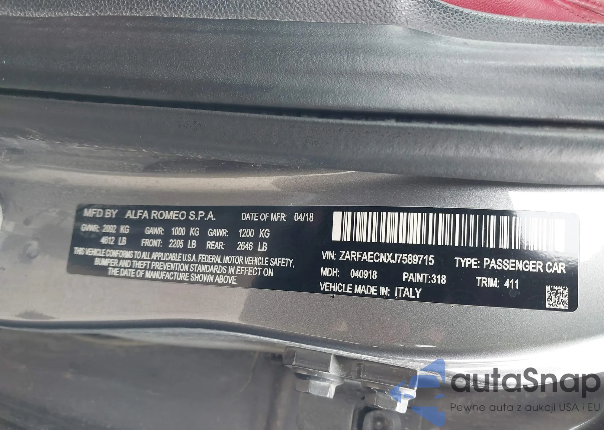 • VIN: ZARFAECNXJ7589715