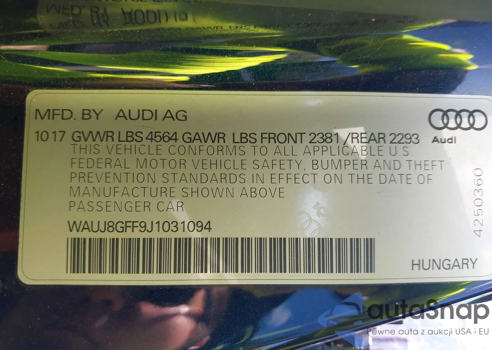 Samochód Audi A3 2018 (VIN WAUJ8GFF9J1031094) nie był wcześniej licytowany. Dokumenty są czyste, przebieg odpowiada lub jest niższy niż średnia rynku. Sprzedaje go firma ubezpieczeniowa – polecamy zakup. Dostawa do portu zajmie ok. 6–8 tygodni.