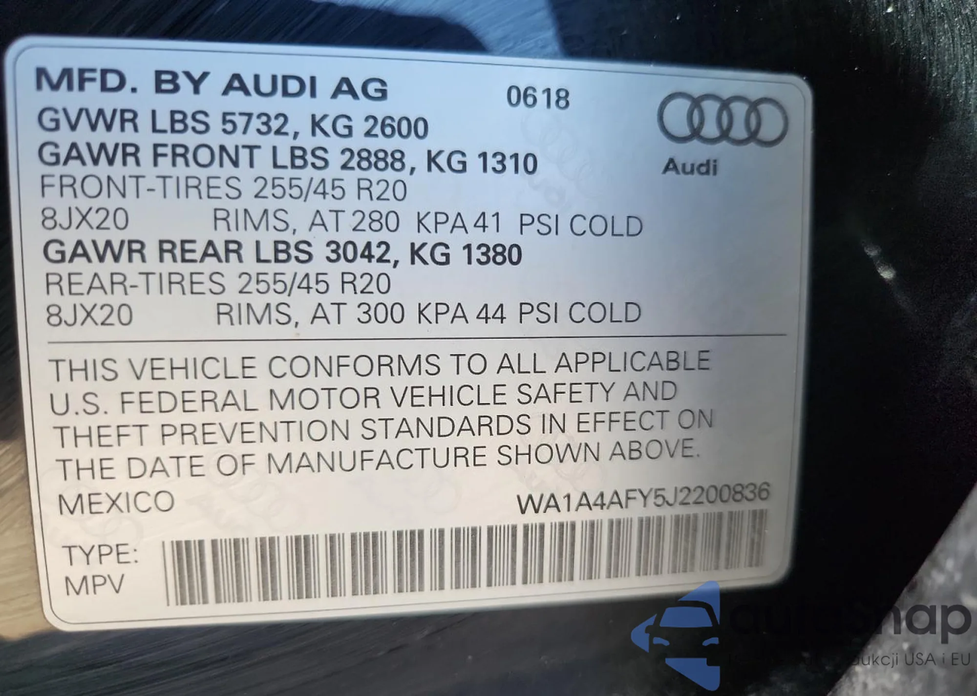 Samochód Audi SQ5 2018 (VIN WA1A4AFY5J2200836) ma dokumenty uniemożliwiające rejestrację. Mogą pojawić się trudności przy eksporcie i rejestracji. Skontaktuj się z ekspertami AutaSnap w celu znalezienia alternatywy.