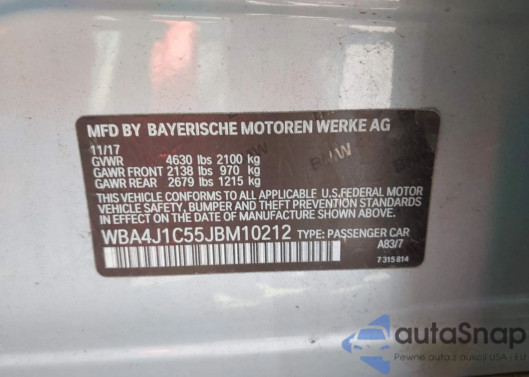 Samochód BMW 4er 2018 (VIN WBA4J1C55JBM10212) nie był wcześniej licytowany. Dokumenty są czyste, przebieg odpowiada lub jest niższy niż średnia rynku. Sprzedaje go firma ubezpieczeniowa – polecamy zakup. Dostawa do portu zajmie ok. 6–8 tygodni.