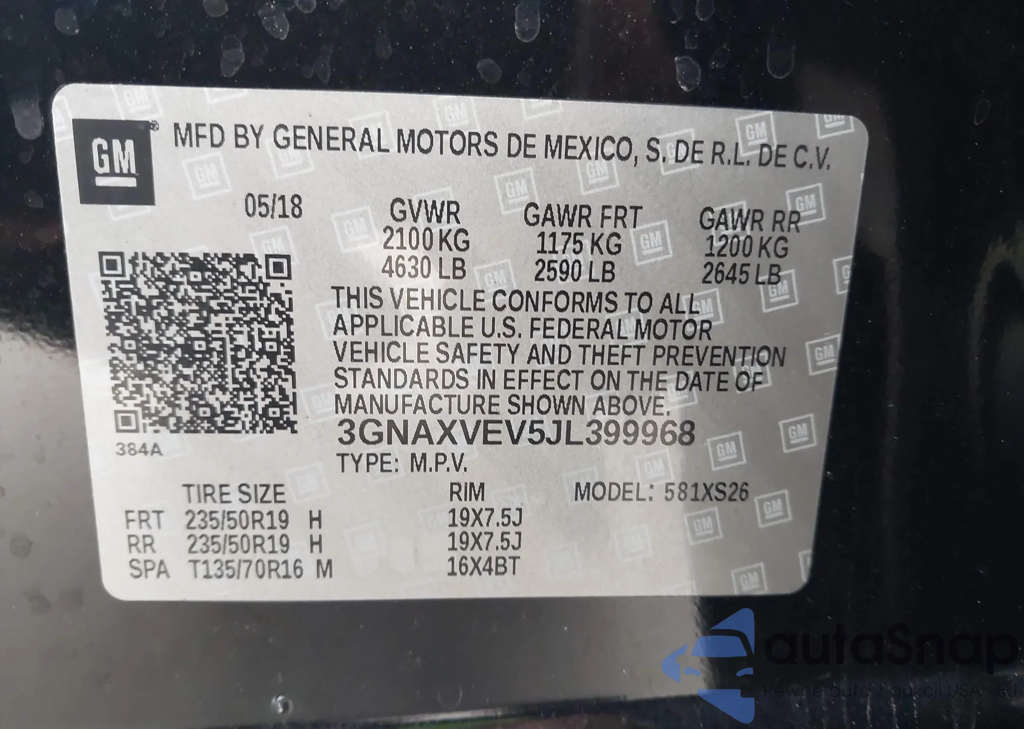 Samochód Chevrolet Equinox 2018 (VIN 3GNAXVEV5JL399968) nie był wcześniej licytowany. Dokumenty są czyste, przebieg odpowiada lub jest niższy niż średnia rynku. Sprzedaje go firma ubezpieczeniowa – polecamy zakup. Dostawa do portu zajmie ok. 6–8 tygodni.