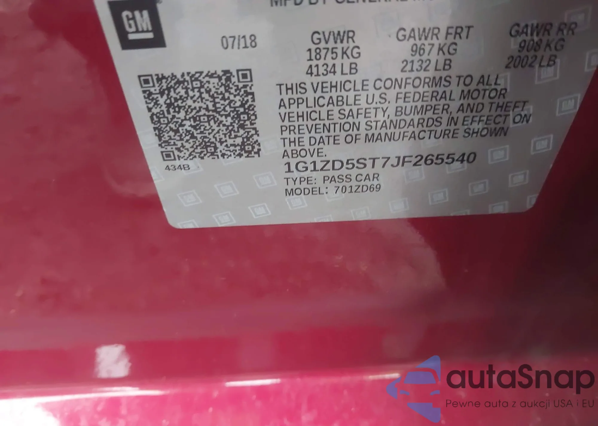 VIN: 1G1ZD5ST7JF265540