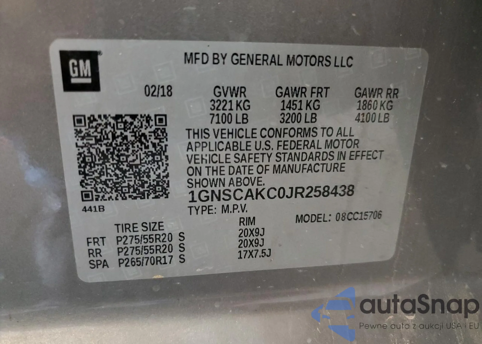 VIN: 1GNSCAKC0JR258438