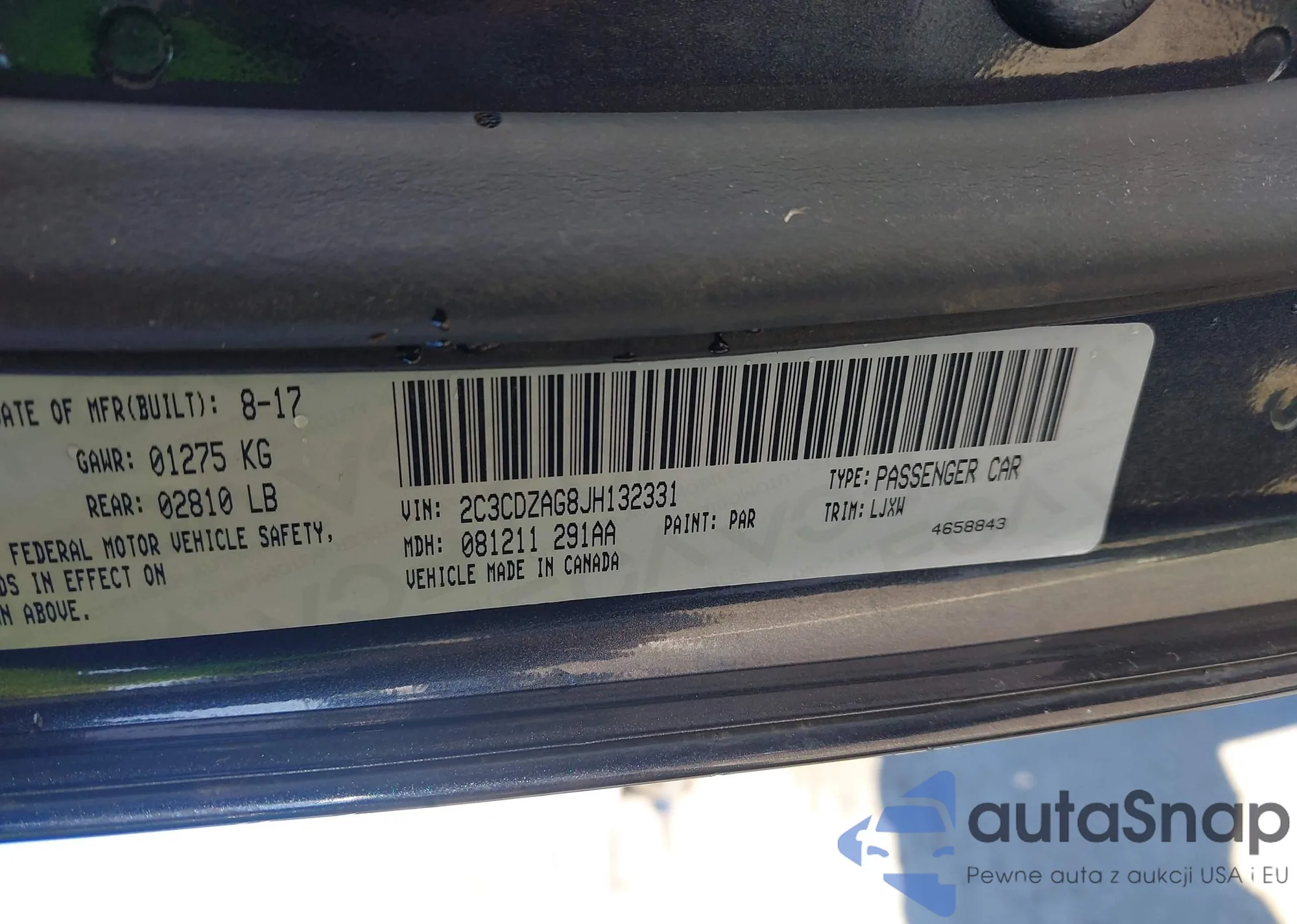 Samochód Dodge Challenger 2018 (VIN 2C3CDZAG8JH132331) nie był wcześniej licytowany. Dokumenty są czyste, przebieg odpowiada lub jest niższy niż średnia rynku. Sprzedaje go firma ubezpieczeniowa – polecamy zakup. Dostawa do portu zajmie ok. 6–8 tygodni.