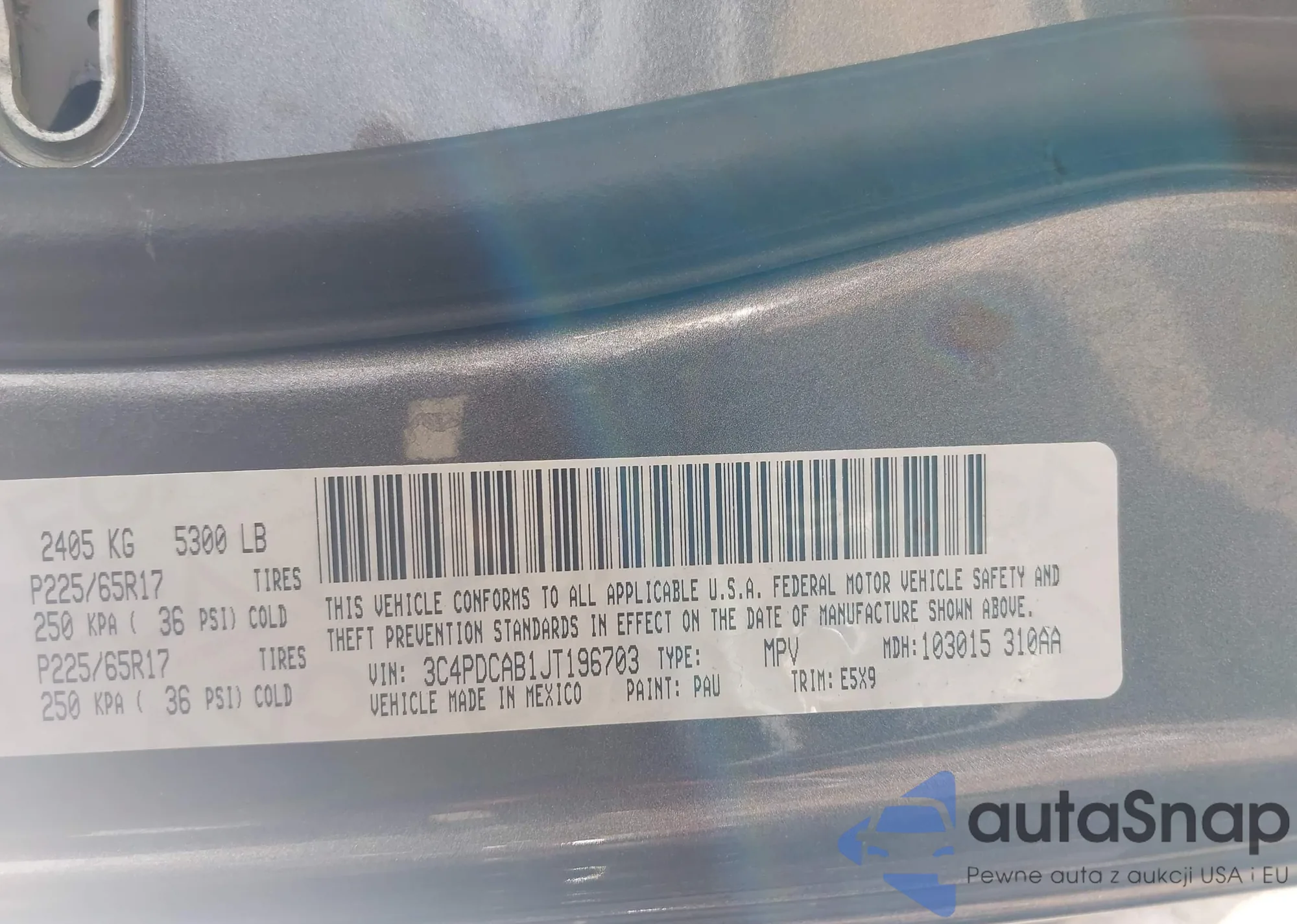 Samochód Dodge Journey 2018 (VIN 3C4PDCAB1JT196703) ma dokumenty uniemożliwiające rejestrację. Mogą pojawić się trudności przy eksporcie i rejestracji. Skontaktuj się z ekspertami AutaSnap w celu znalezienia alternatywy.