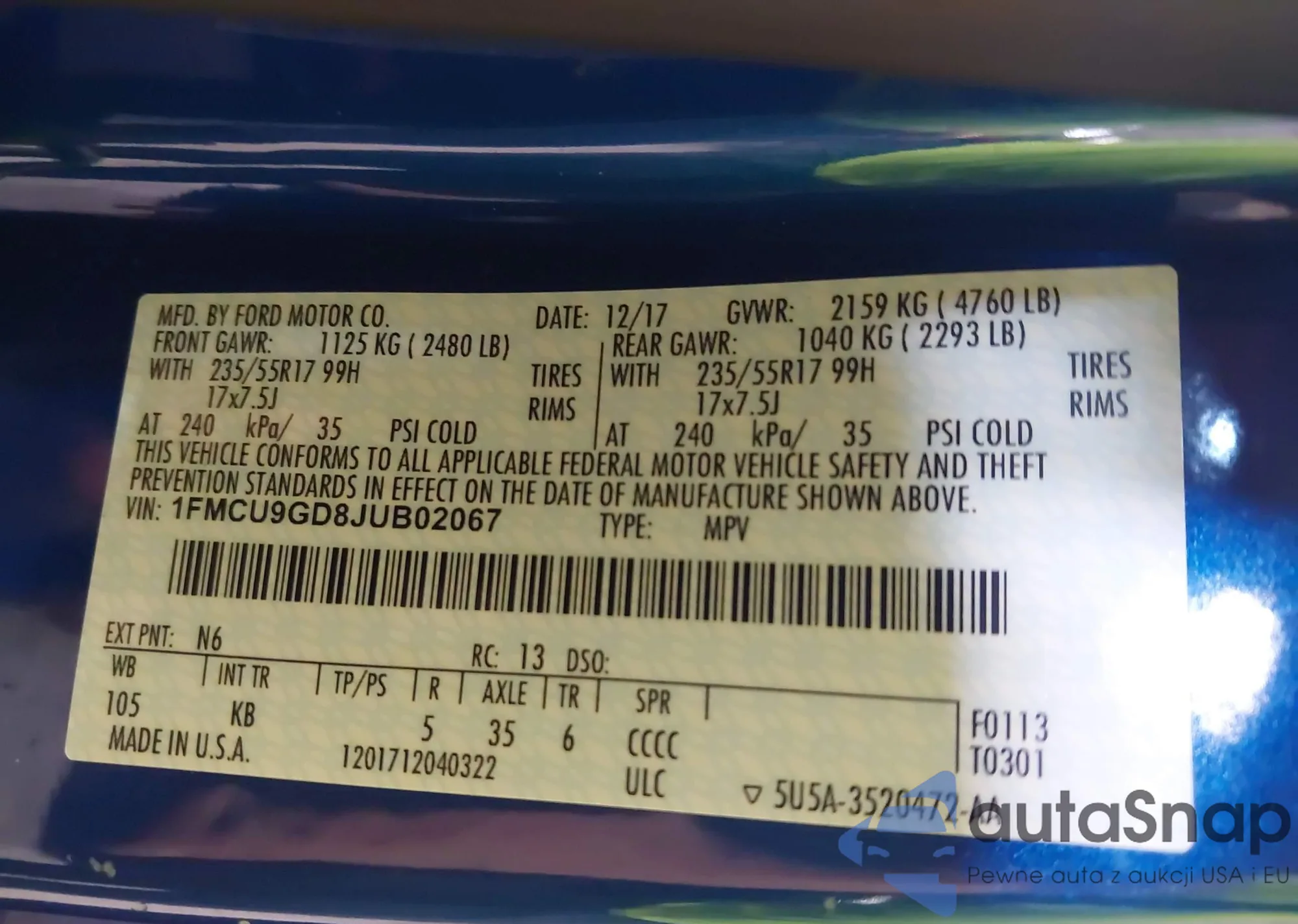 VIN: 1FMCU9GD8JUB02067