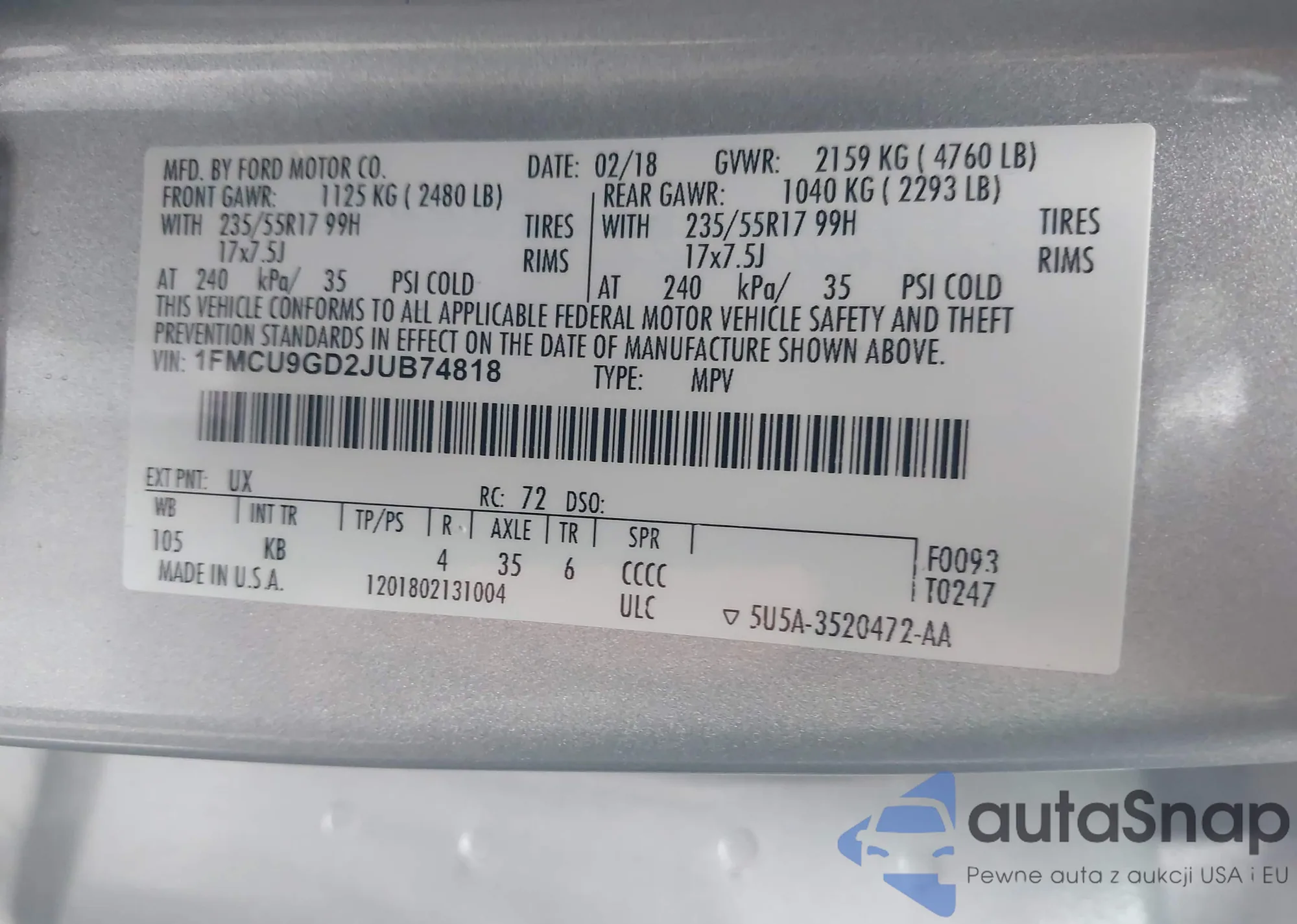 VIN: 1FMCU9GD2JUB74818