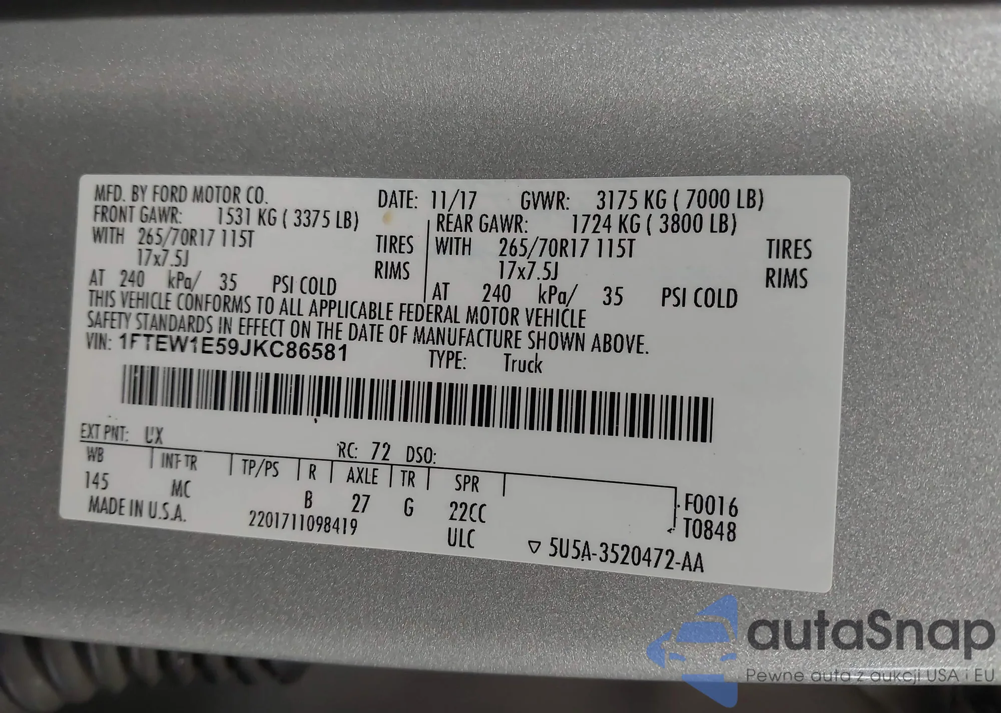 Samochód Ford F-150 2018 (VIN 1FTEW1E59JKC86581) nie był wcześniej licytowany. Dokumenty są czyste, przebieg odpowiada lub jest niższy niż średnia rynku. Sprzedaje go firma ubezpieczeniowa – polecamy zakup. Dostawa do portu zajmie ok. 6–8 tygodni.