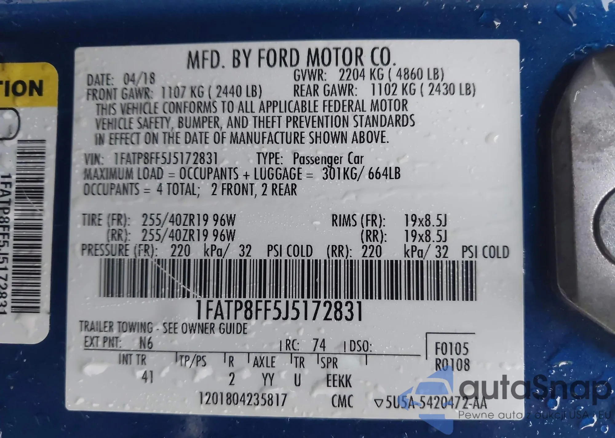 Samochód Ford Mustang 2018 (VIN 1FATP8FF5J5172831) ma dokumenty uniemożliwiające rejestrację. Mogą pojawić się trudności przy eksporcie i rejestracji. Skontaktuj się z ekspertami AutaSnap w celu znalezienia alternatywy.