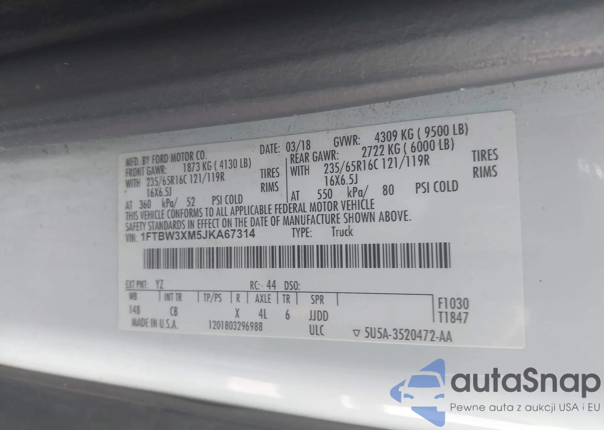 VIN: 1FTBW3XM5JKA67314
