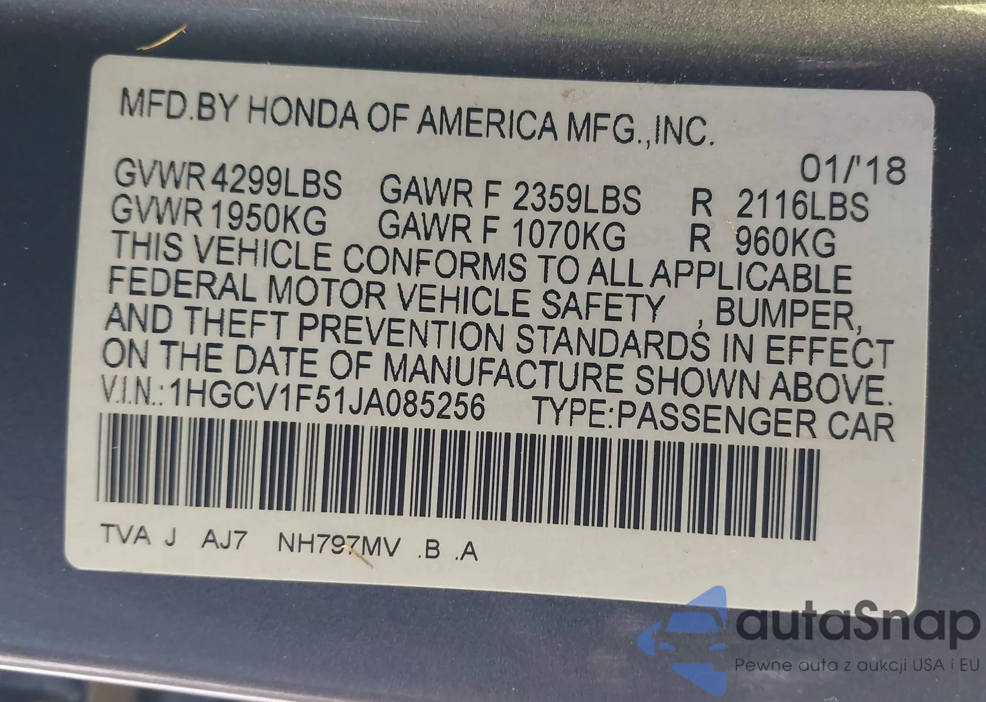 VIN: 1HGCV1F51JA085256