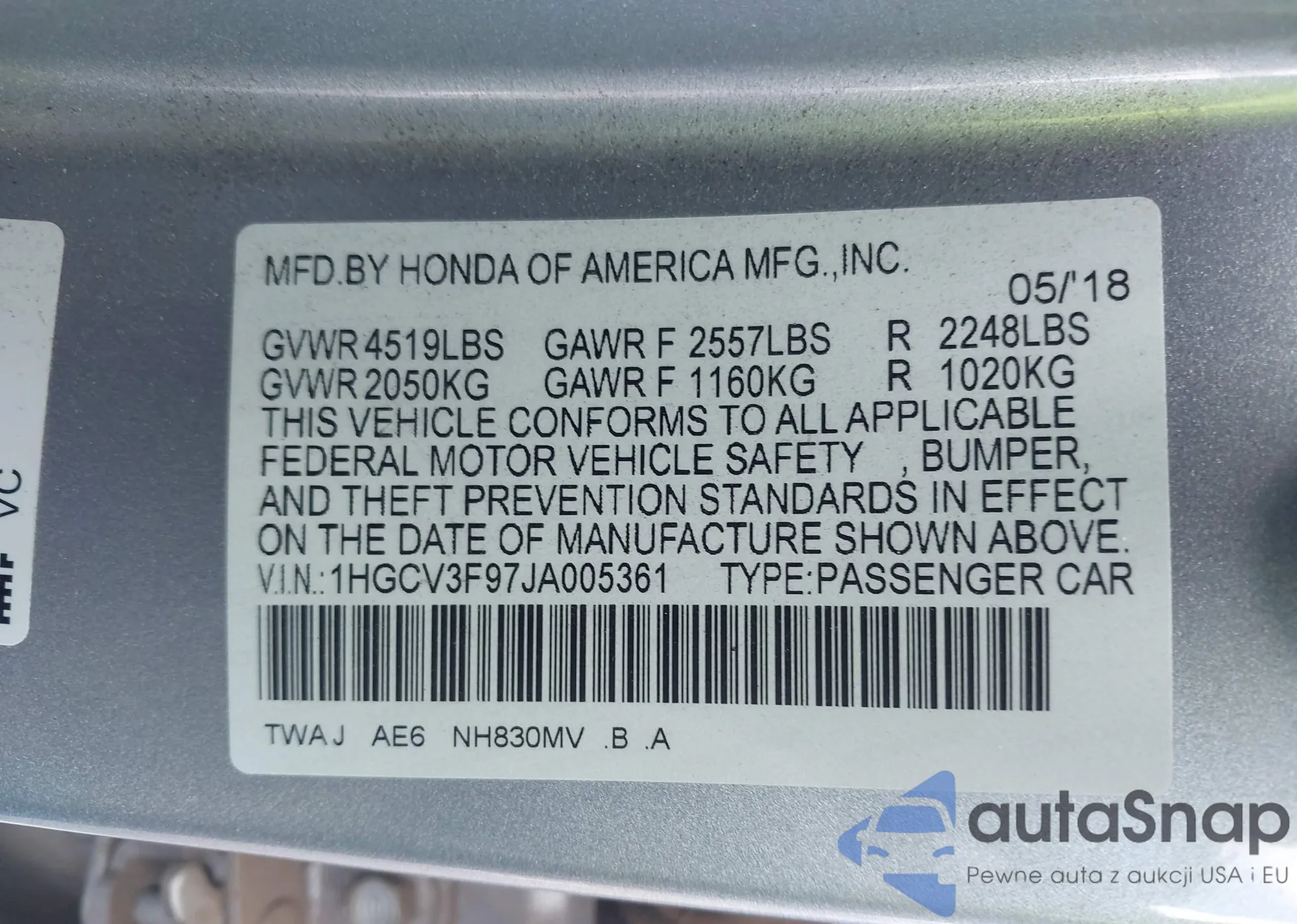 • VIN: 1HGCV3F97JA005361