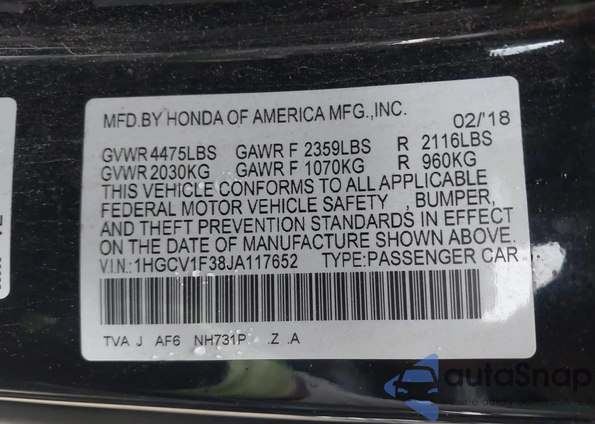 VIN: 1HGCV1F38JA117652