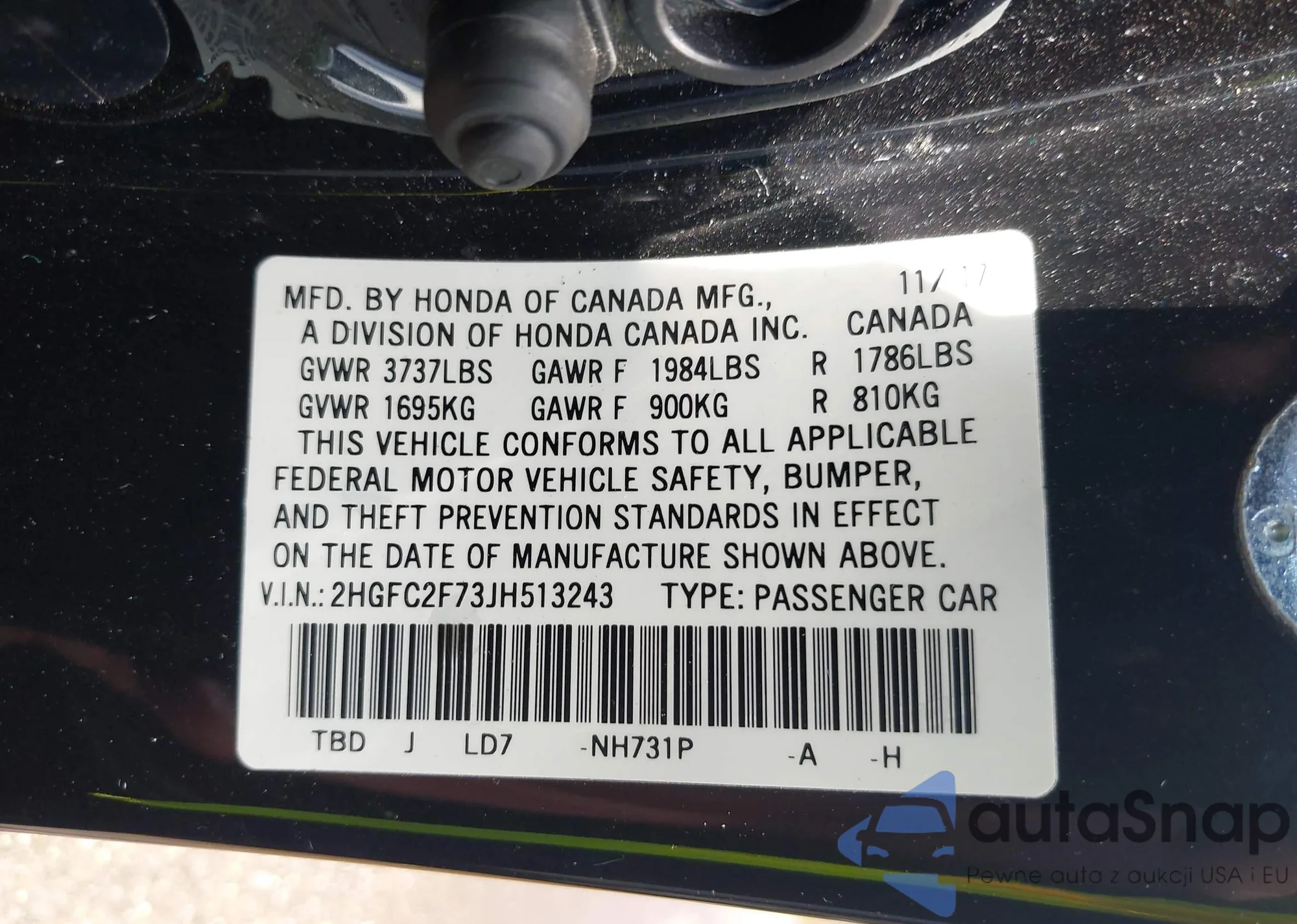 VIN: 2HGFC2F73JH513243