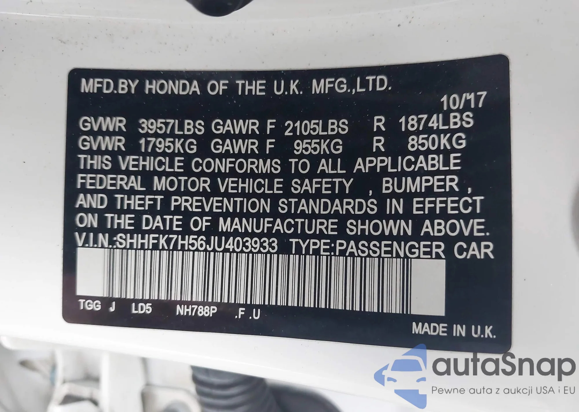 Samochód Honda Civic 2018 (VIN SHHFK7H56JU403933) nie był wcześniej licytowany. Dokumenty są czyste, przebieg odpowiada lub jest niższy niż średnia rynku. Sprzedaje go firma ubezpieczeniowa – polecamy zakup. Dostawa do portu zajmie ok. 6–8 tygodni.