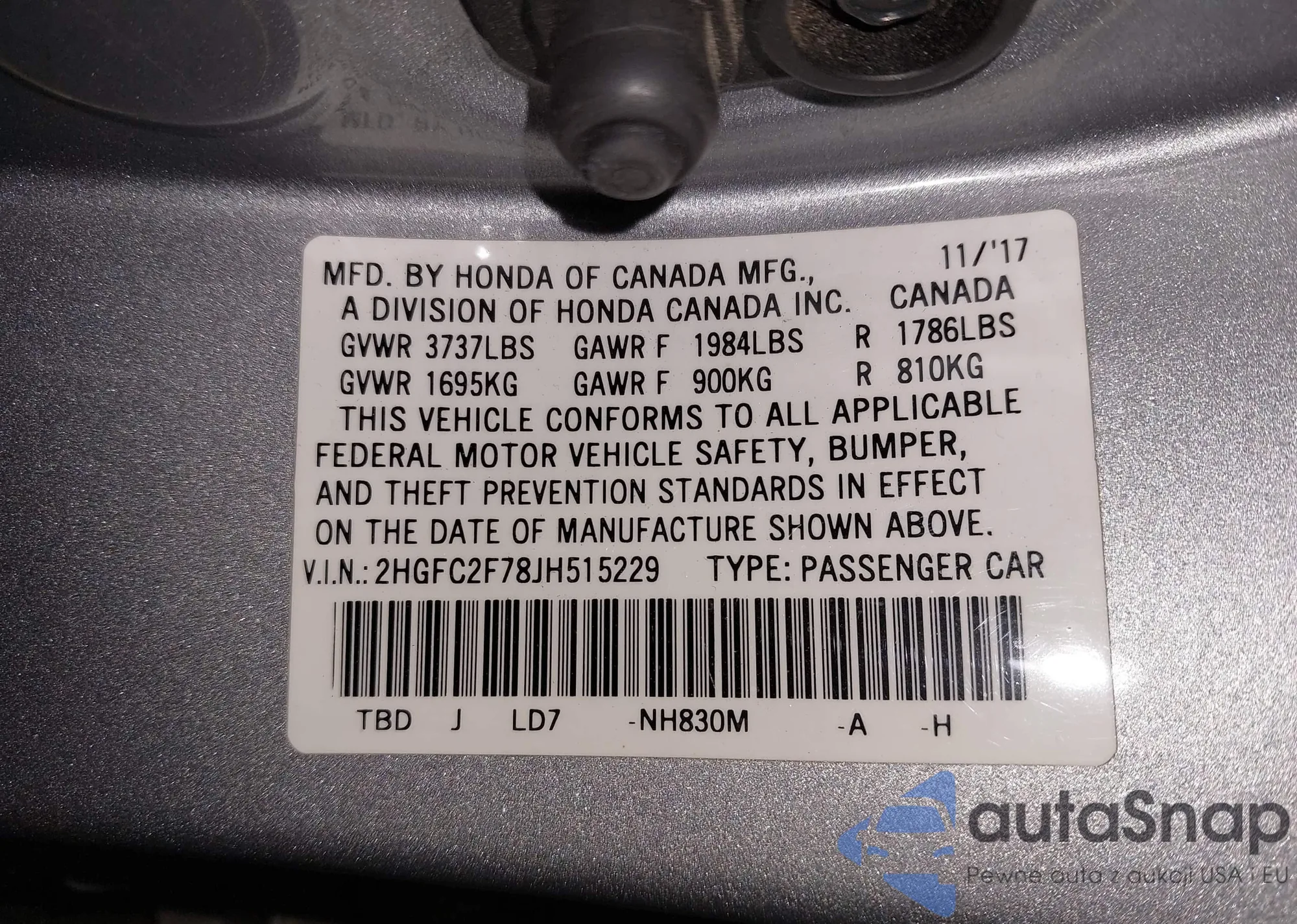 VIN: 2HGFC2F78JH515229