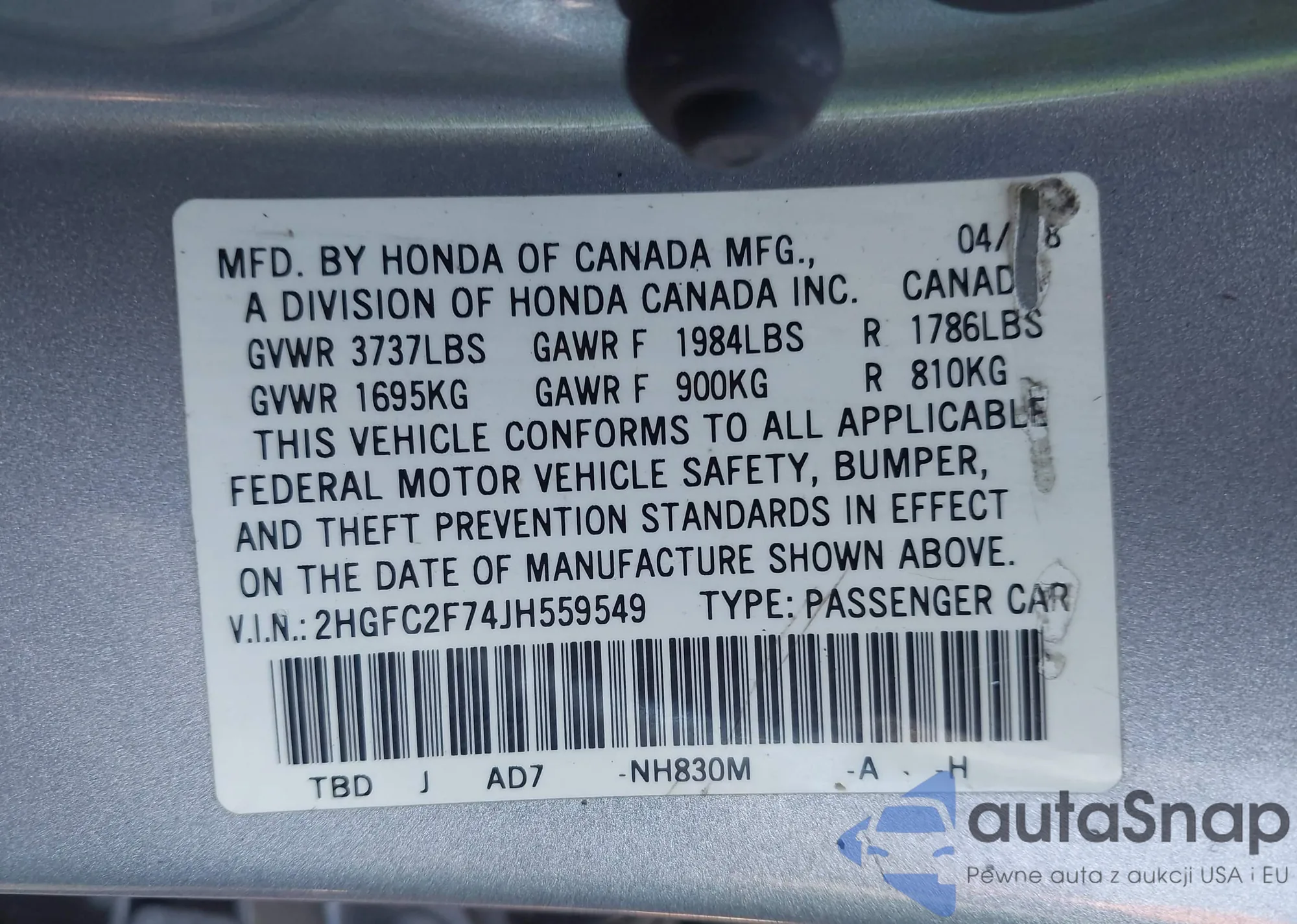 Samochód Honda Civic 2018 (VIN 2HGFC2F74JH559549) nie był wcześniej licytowany. Dokumenty są czyste, przebieg odpowiada lub jest niższy niż średnia rynku. Sprzedaje go firma ubezpieczeniowa – polecamy zakup. Dostawa do portu zajmie ok. 6–8 tygodni.