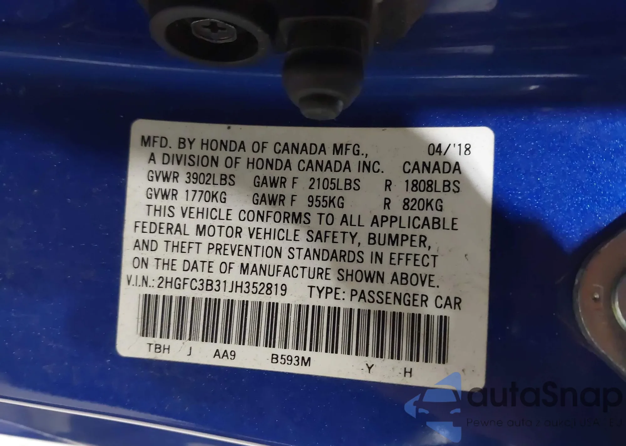 Samochód Honda Civic 2018 (VIN 2HGFC3B31JH352819) nie był wcześniej licytowany. Dokumenty są czyste, przebieg odpowiada lub jest niższy niż średnia rynku. Sprzedaje go firma ubezpieczeniowa – polecamy zakup. Dostawa do portu zajmie ok. 6–8 tygodni.