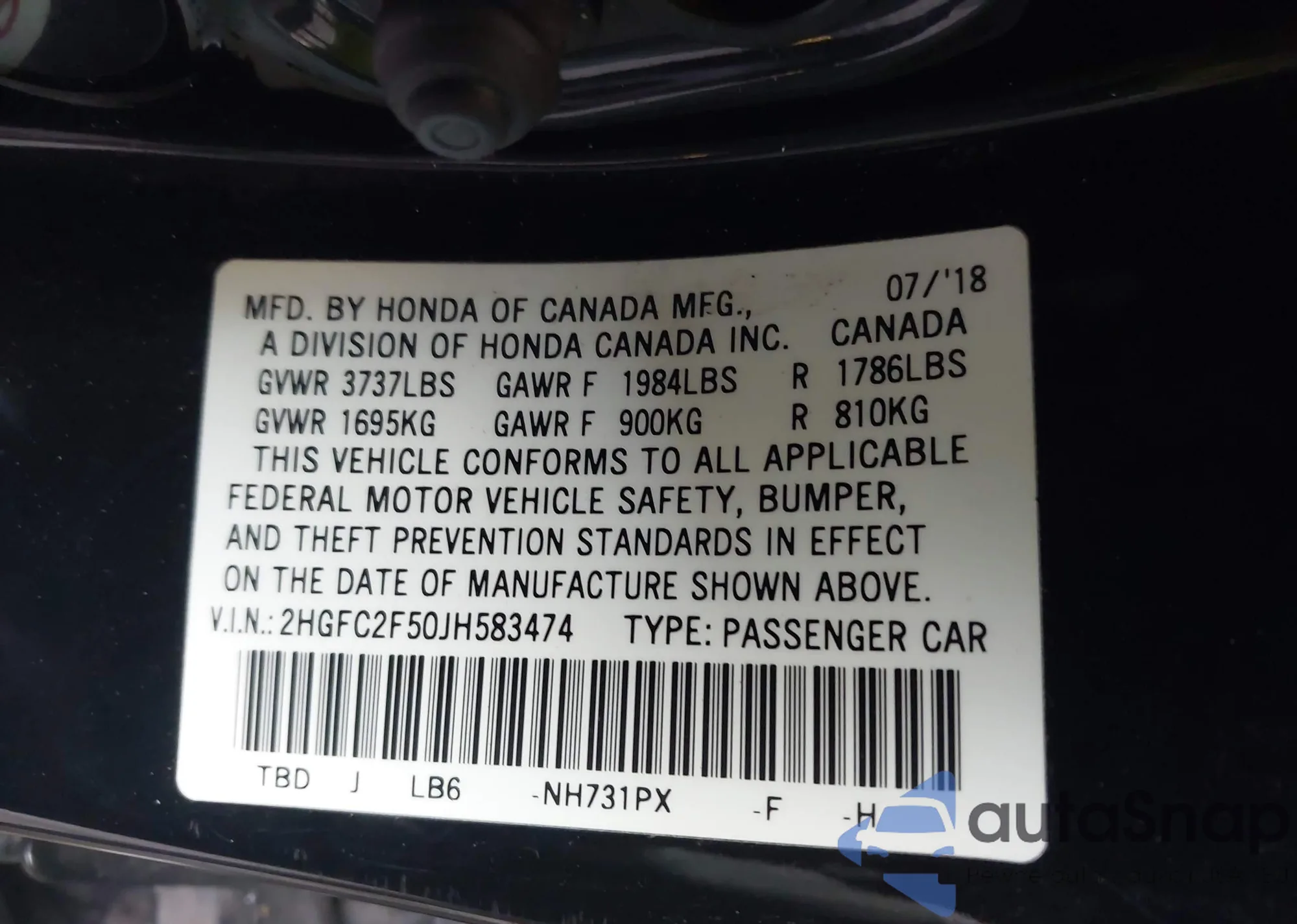 VIN: 2HGFC2F50JH583474