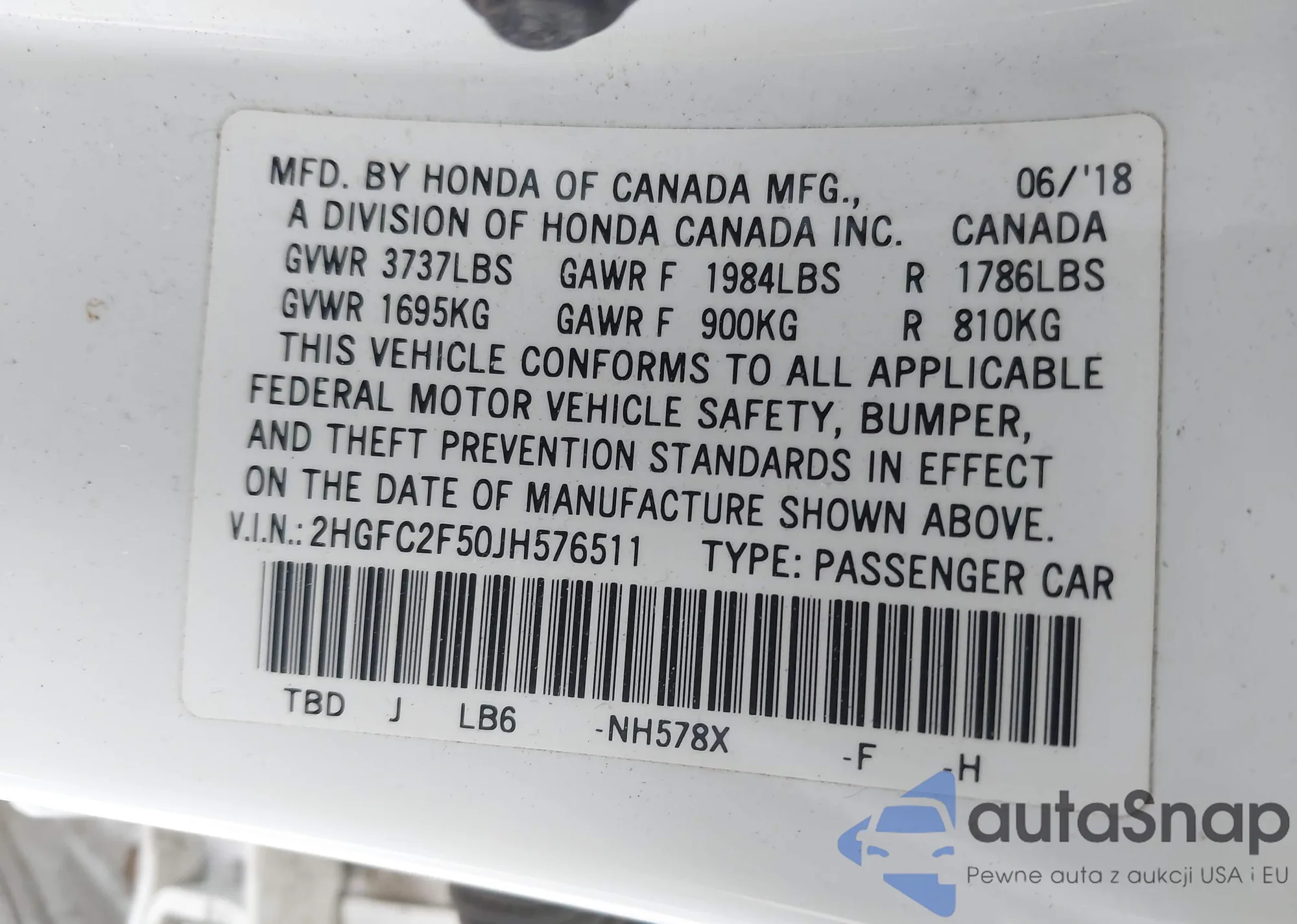 VIN: 2HGFC2F50JH576511