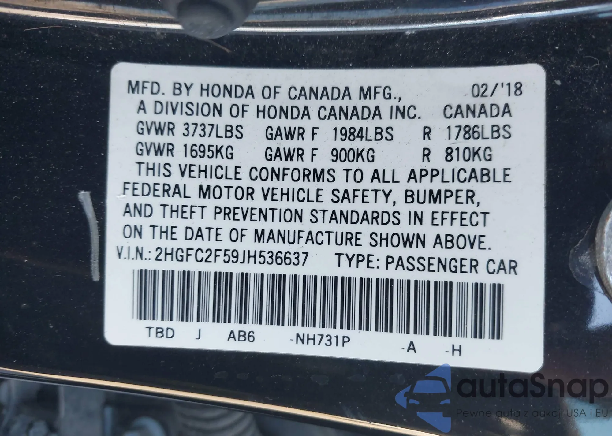 VIN: 2HGFC2F59JH536637