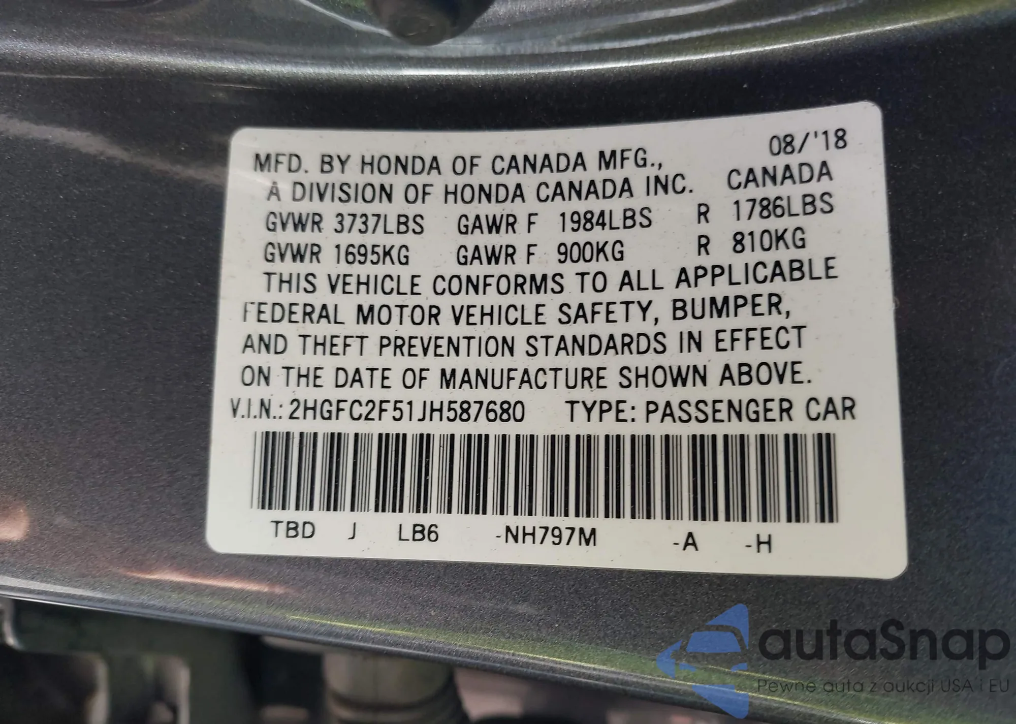VIN: 2HGFC2F51JH587680